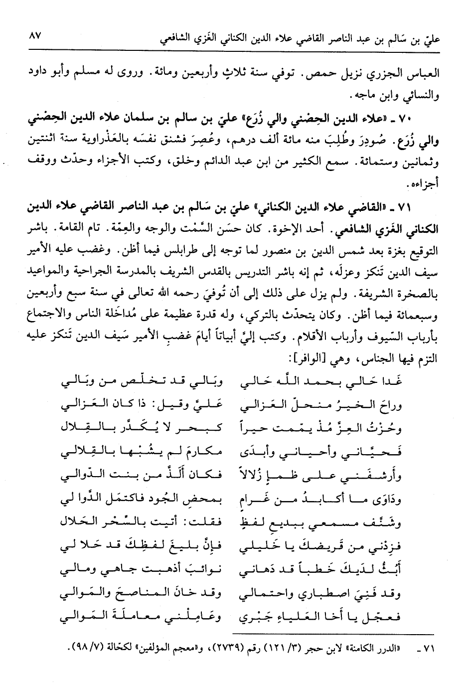 القَاضِي عَلَاء الدّين الْكِنَانِي عَليّ بن سَالم بن عبد النَّاصِر القَاضِي عَلَاء الدّين الْكِنَانِي الْغَزِّي الشَّافِعِي أحد الاخوة كَانَ حسن السمت وَالْوَجْه والعمة تَامّ الْقَامَة بَاشر التوقيع بغزة بعد شمس الدّين بن مَنْصُور لما)