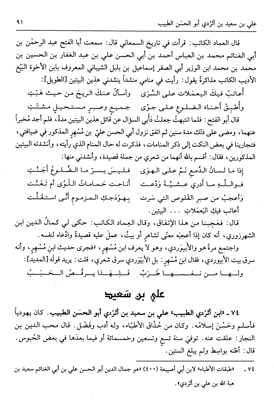 ابْن أثردي الطَّبِيب عَليّ بن سعيد بن أثردي أَبُو الْحسن الطَّبِيب كَانَ يَهُودِيّا فَأسلم وَحسن إِسْلَامه وَكَانَ من حذاق الْأَطِبَّاء وَله أدب وَفضل قَالَ محب الدّين ابْن النجار علقت عَنهُ توفّي سنة تسع وَتِسْعين وَخمْس مائَة أَو فِيمَا بعْدهَا فِي بعض الحبوس قَالَ أَظُنهُ بواسط وَلم يبلغ السِّتين