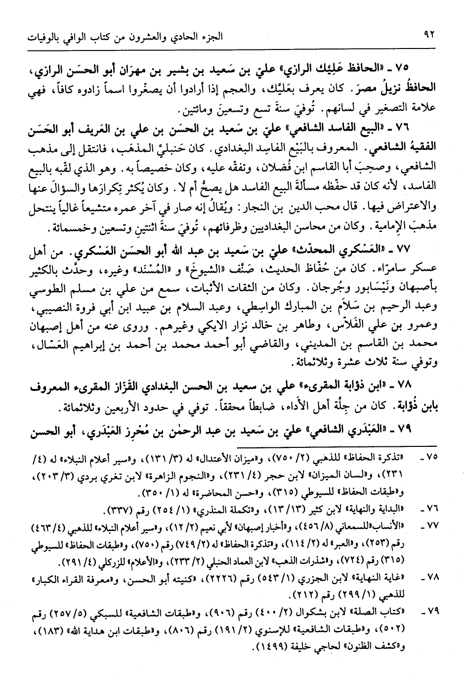البيع الْفَاسِد الشَّافِعِي عَليّ بن سعيد بن الْحسن بن عَليّ بن العريف أَبُو الْحسن الْفَقِيه الشَّافِعِي الْمَعْرُوف بِالْبيعِ الْفَاسِد الْبَغْدَادِيّ كَانَ حنبلي الْمَذْهَب فانتقل إِلَى مَذْهَب الشَّافِعِي وَصَحب أَبَا الْقَاسِم ابْن فضلان وتفقه عَلَيْهِ وَكَانَ خصيصاً بِهِ وَهُوَ الَّذِي لقبه بِالْبيعِ الْفَاسِد لِأَنَّهُ كَانَ قد حفظه مَسْأَلَة البيع الْفَاسِد هَل يَصح أم لَا وَكَانَ يكثر تكرارها وَالسُّؤَال عَنْهَا والاعتراض فِيهَا قَالَ محب الدّين ابْن النجار وَيُقَال أَنه صَار فِي آخر عمره متشيعاً غالياً ينتحل مَذْهَب الإمامية