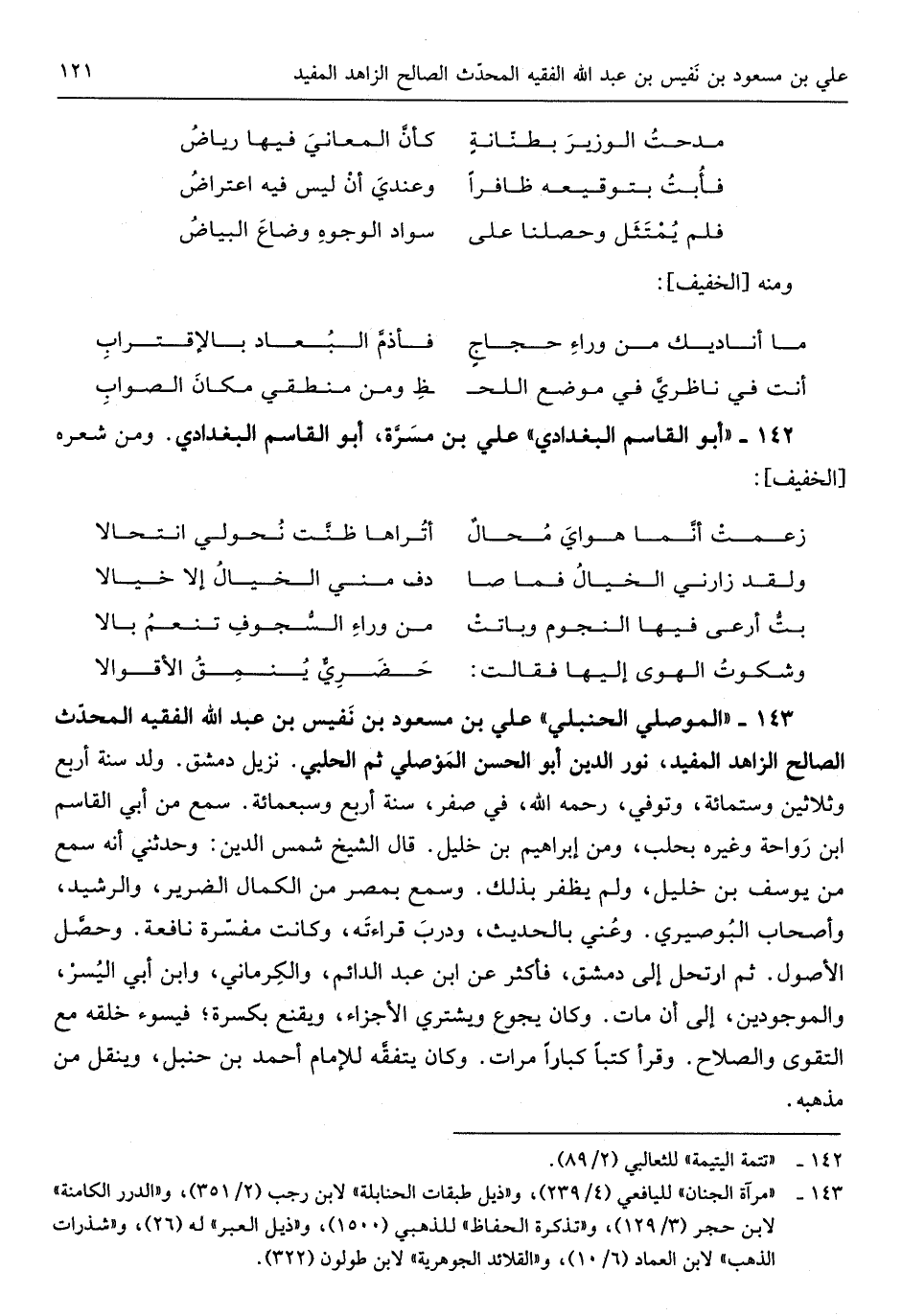 عَليّ بن مَسْعُود بن نَفِيس بن عبد الله الْفَقِيه المحدِّث الصَّالح الزَّاهِد الْمُفِيد نور الدّين أَبُو الْحسن المَوْصلي ثمَّ الْحلَبِي نزيل دمشق ولد سنة أَربع وَثَلَاثِينَ وست مائَة وَتُوفِّي رَحمَه الله فِي صفر سنة أَربع وَسبع مائَة سمع من أبي الْقَاسِم ابْن رَوَاحَة وَغَيره بحلب وَمن إِبْرَاهِيم بن خَلِيل قَالَ الشَّيْخ شمس الدّين وحدَّثني أَنه سمع من يُوسُف بن خَلِيل وَلم يظفر بذلك وَسمع بِمصْر من الْكَمَال الضَّرِير والرشيد وَأَصْحَاب البُصيري وعُني بِالْحَدِيثِ ودرَّبَ قِرَاءَته وَكَانَت مفسّرة نافعة وحصَّل الأُصول ثمَّ ارتحل إِلَى دمشق فَأكْثر عَن ابْن عبد الدَّائِم والكِرماني وَابْن أبي اليُسر والموجودين إِلَى أَن مَاتَ وَكَانَ يجوع وَيَشْتَرِي الأَجزاء ويقنع بكسرة فيسوء خلقه مَعَ التَّقْوَى وَالصَّلَاح قَرَأَ كتبا كبارًا مرَّات وَكَانَ يتفقَّه للْإِمَام أَحْمد بن حَنْبَل وينقل من مذْهبه