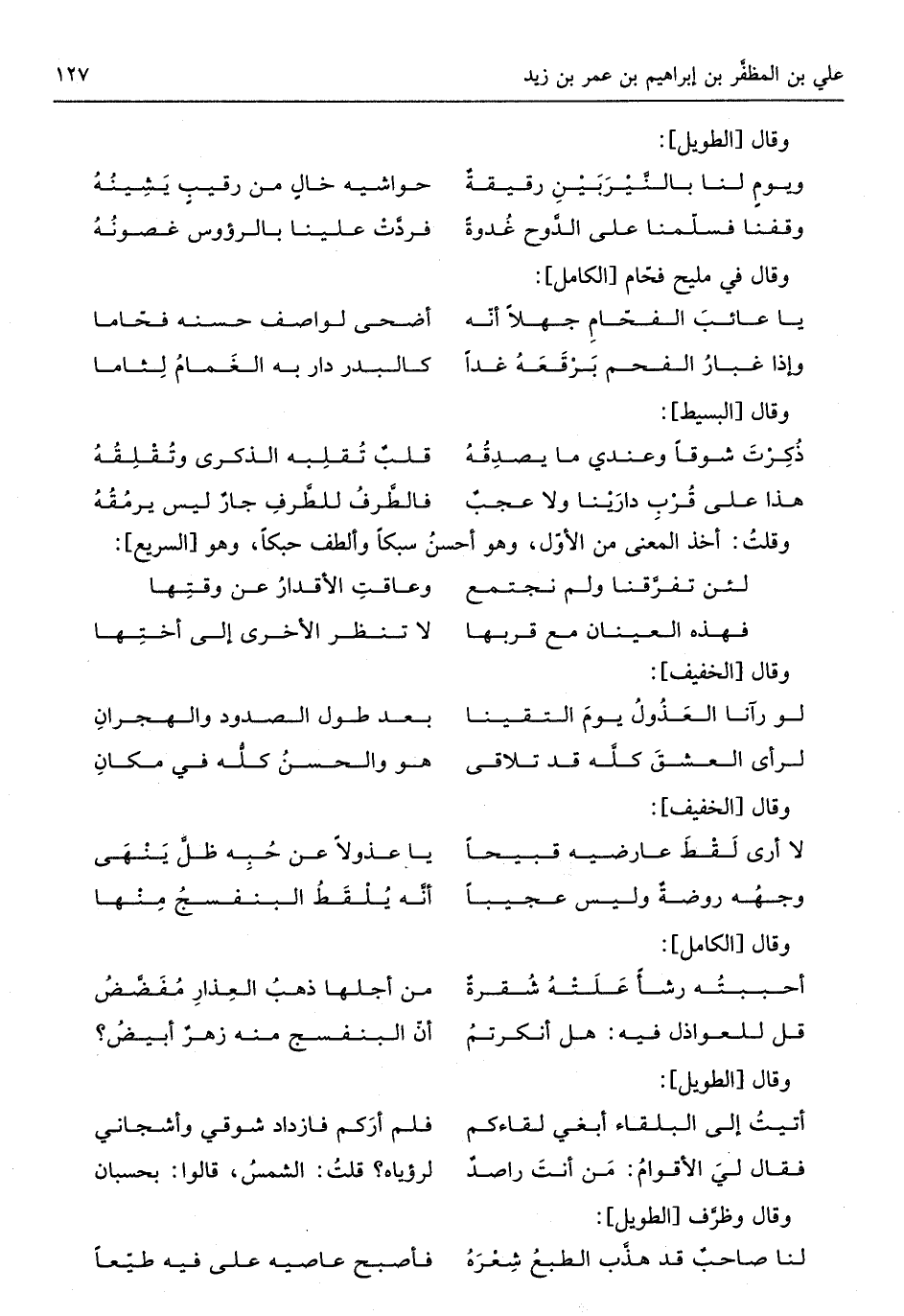 (قل للعواذل فِيهِ هَل أنكرتمُ ... أنَّ البنفسج مِنْهُ زهرٌ أبيضُ)