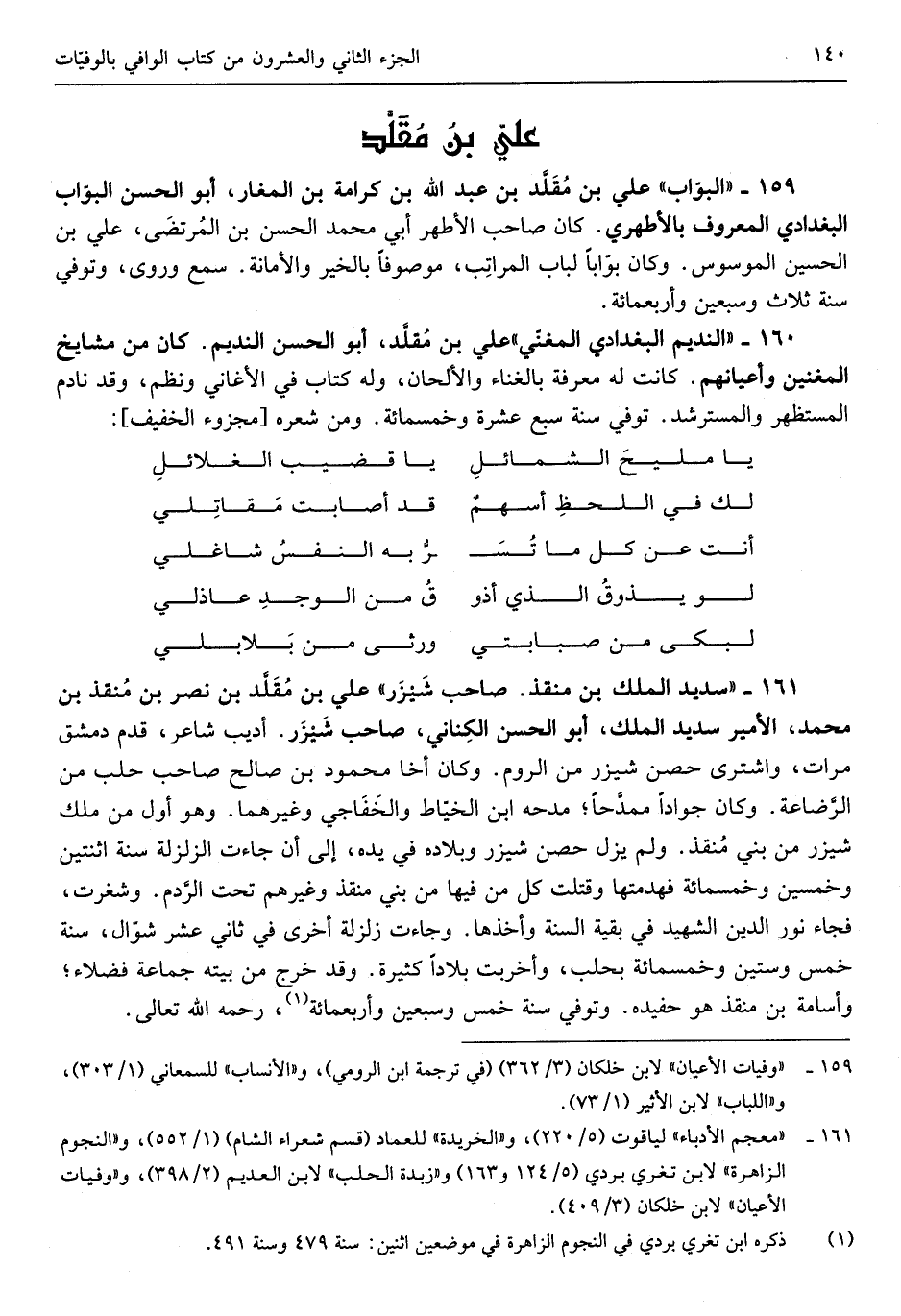 عَليّ بن مُقلَّد بن نصر بن مُنقذ بن مُحَمَّد الْأَمِير سديد الْملك أَبُو الْحسن الكِناني صَاحب شَيْزَر أديب شَاعِر قدم دمشق مَرَّات وَاشْترى حصن شيزر من الرّوم وَكَانَ أَخا مَحْمُود بن صَالح صَاحب حلب من الرِّضاعة وَكَانَ جواداً ممدَّحاً مدحه ابْن الخيّاط والخَفاجي وَغَيرهمَا وَهُوَ أول من ملك شيزر من بني مُنقذ وَلم يزل حصن شيزر وبلاده فِي يَده إِلَى أَن جَاءَت الزلزلة سنة اثْنَتَيْنِ وَخمسين وَخمْس مائَة فهدمتها وَقتلت كل من فِيهَا من بني مُنقذ وَغَيرهم تَحت الرَّدم وشغرت فجَاء نور الدّين الشَّهِيد فِي بَقِيَّة السّنة وَأَخذهَا وَجَاءَت زَلْزَلَة أُخْرَى فِي ثَانِي عشر شَوَّال سنة خمس وَسِتِّينَ وَخمْس مائَة بحلب وأخربت بلاداً كَثِيرَة وَقد خرج من بَيته جمَاعَة فضلاء وَأُسَامَة بن منقذ هُوَ حفيده وَتُوفِّي سنة خمس وَسبعين وَأَرْبع مائَة رَحمَه الله تَعَالَى