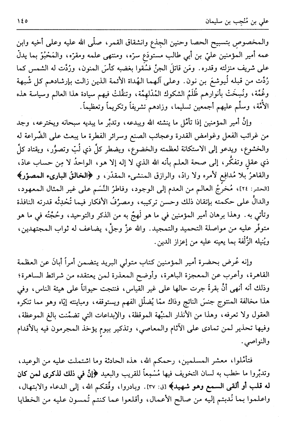 والمخصوص بتسبيح الْحَصَى وحنين الجِذعِ وانشقاق الْقَمَر صلّى الله عَلَيْهِ وعَلى أَخِيه وَابْن عمّه أَمِير الْمُؤمنِينَ عَليّ بن أبي طَالب مستودع سرِّه ومنتهى علمه ومقرّه والمحبُوِّ بِمَا يدل على شرِيف مَنْزِلَته وَقدره وَمن قَاتل الجنّ فسُقوا بغضبه كأس الْمنون وردَّت لَهُ الشَّمْس كَمَا ردَّت من قبله ليوشع بن نون وعَلى آلهما الهداة الأئمَّة الَّذين زَالَت بإرشادهم كلّ شُبْهَة وغمَّة وَنسخت بأنوارهم ظلم الشكوك المدلهمَّة وتنقَّلت فيهم سيادة هَذَا الْعَالم وسياسة هَذِه الأمَّة ويلَّم عَلَيْهِم أَجْمَعِينَ تَسْلِيمًا وَزَادَهُمْ تَشْرِيفًا وتكريماً وتعظيما