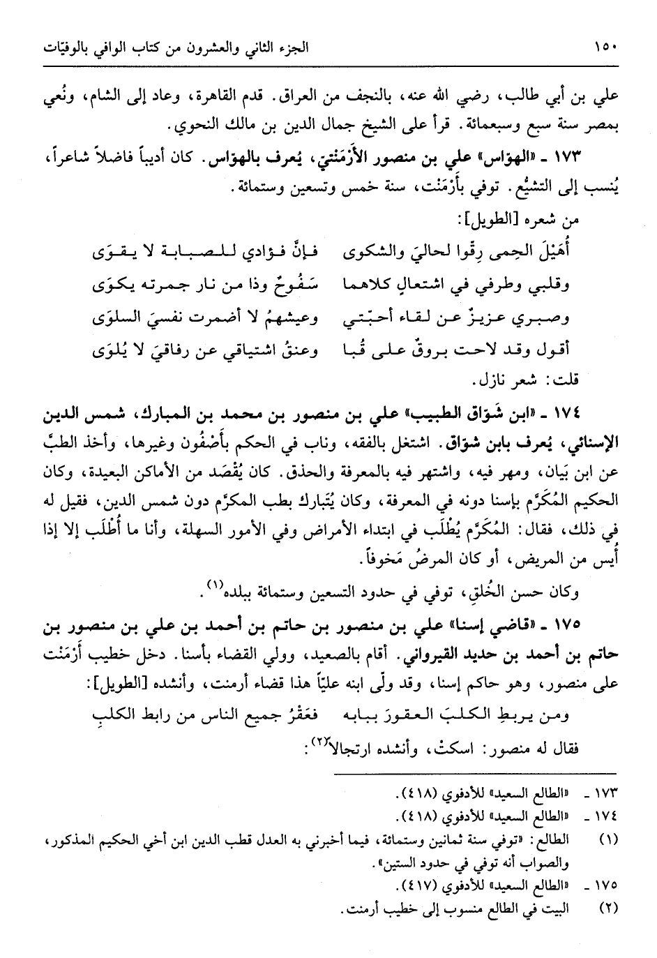 عَليّ بن أبي طَالب رَضِي الله عَنهُ بالنجف من الْعرَاق قدم الْقَاهِرَة وَعَاد إِلَى الشَّام ونُعي بِمصْر سنة سبع وَسبع مائَة قَرَأَ على الشَّيْخ جمال الدّين ابْن مَالك النَّحْوِيّ