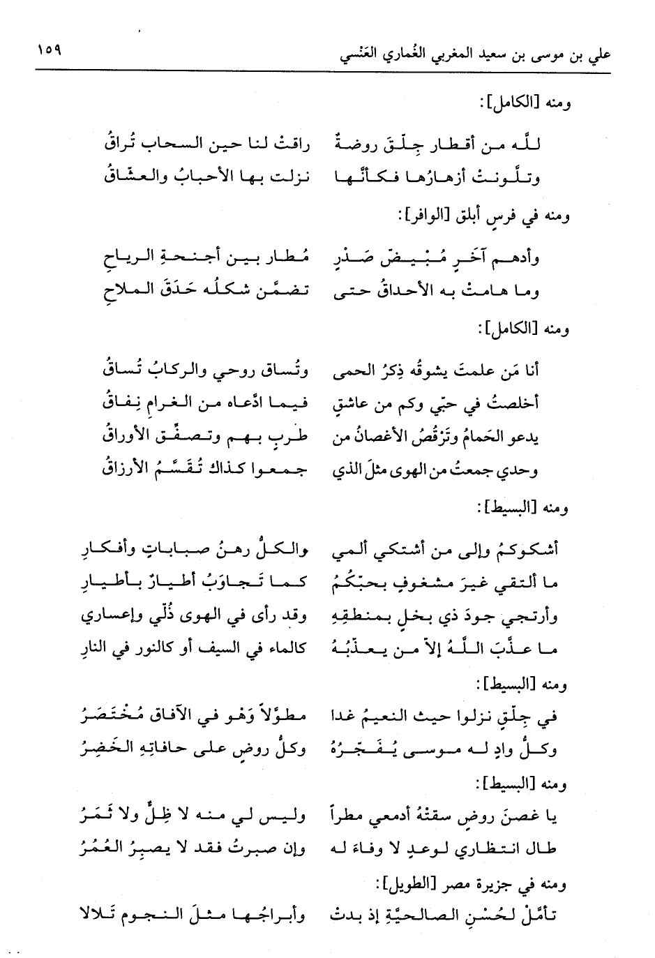 (مَا ألتقي غير مشغوفٍ بحبّكُمُ ... كَمَا تجاوبُ أطيارٌ بأطيارِ)
