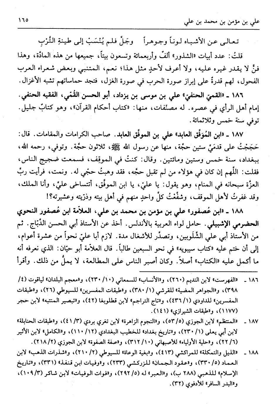 عَليّ بن مُؤمن بن مُحَمَّد بن عَليّ العلاّمة ابْن عُصفور النَّحْوِيّ الْحَضْرَمِيّ الإشبيلي حَامِل لِوَاء الْعَرَبيَّة بالأندلس أَخذ عَن الْأُسْتَاذ أبي الْحسن الدَّبّاج ثمَّ من الْأُسْتَاذ أبي عَليّ الشَّلوبين وتصدَّر للأشغال مُدَّة لَازم أَبَا عليّ نَحوا من عشرَة أَعْوَام إِلَى أَن ختم عَلَيْهِ كتاب سِيبَوَيْهٍ فِي نَحْو السّبْعين طَالبا قَالَ العلاّمة أَو حيّان الَّذِي نعرفه أَنه مَا أكمل عَلَيْهِ الْكتاب أصلا وَكَانَ أَصْبِر النَّاس على المطالعة لَا يملُّ من ذَلِك وأقرأ