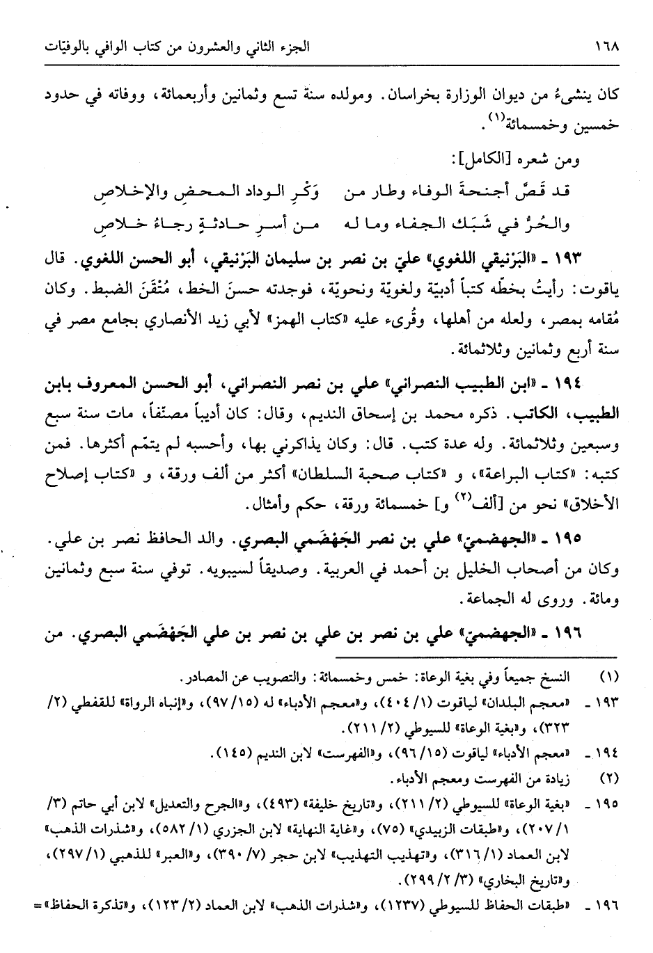 النديم وَقَالَ كَانَ أديباً مصنِّفاً مَاتَ سنة سبع وَسبعين وَثَلَاث مائَة وَله عدَّة كتب قَالَ وَكَانَ يذاكرني بهَا وَأَحْسبهُ لم يتمِّم أَكْثَرهَا فَمن كتبه كتاب البراعة وَكتاب صُحْبَة السُّلْطَان أَكثر من ألف ورقة وَكتاب إصْلَاح الْأَخْلَاق نَحْو من ألف وَخمْس مائَة ورقة حكم وأمثال