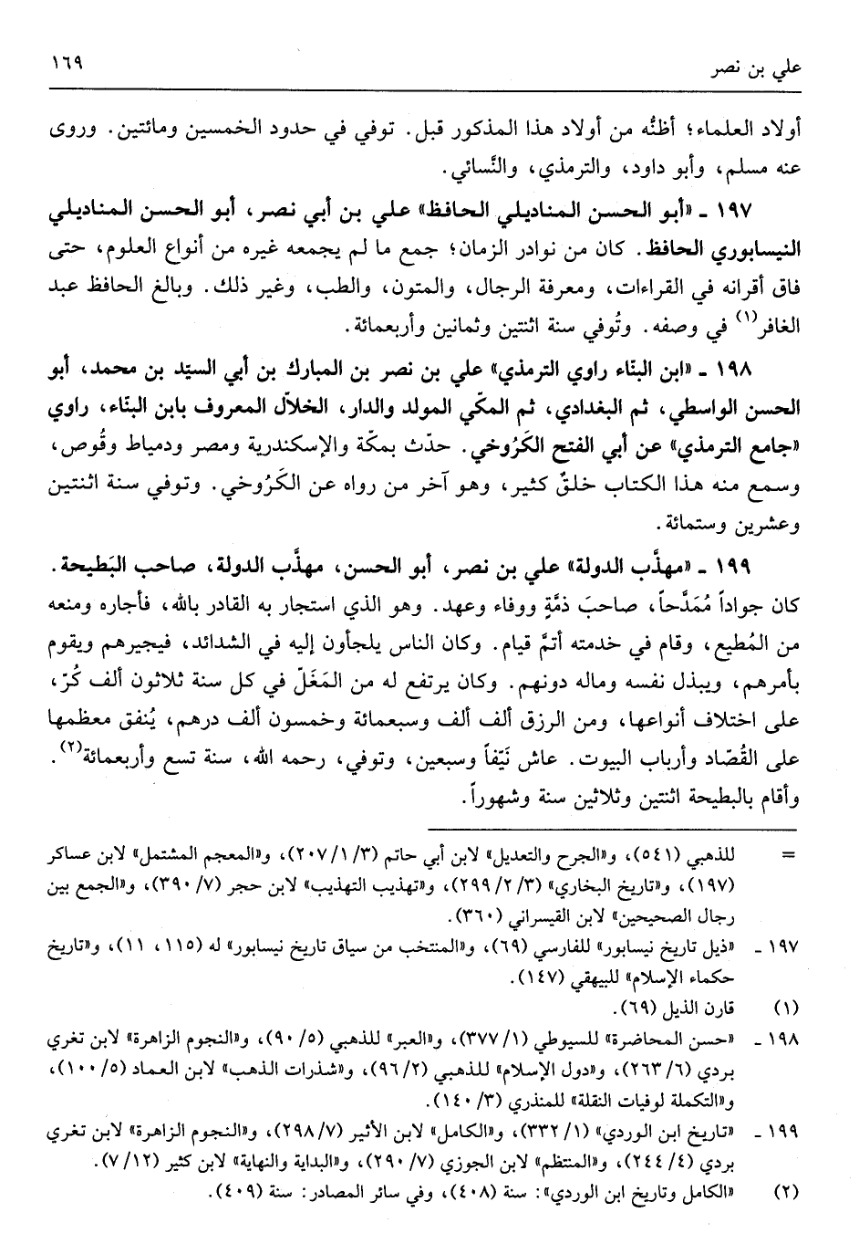 عَليّ بن أبي نصر أَبُو الْحسن المناديلي النَّيْسَابُورِي الْحَافِظ كَانَ من نَوَادِر الزَّمَان جمع مَا لم يجمعه غَيره من أَنْوَاع الْعُلُوم حتَّى فاق أقرانه فِي الْقرَاءَات وَمَعْرِفَة الرِّجَال والمتون والطب وَغير ذَلِك وَبَالغ الْحَافِظ عبد الغافر فِي وَصفه وتوفِّي سنة اثْنَتَيْنِ وَثَمَانِينَ وَأَرْبع مائَة