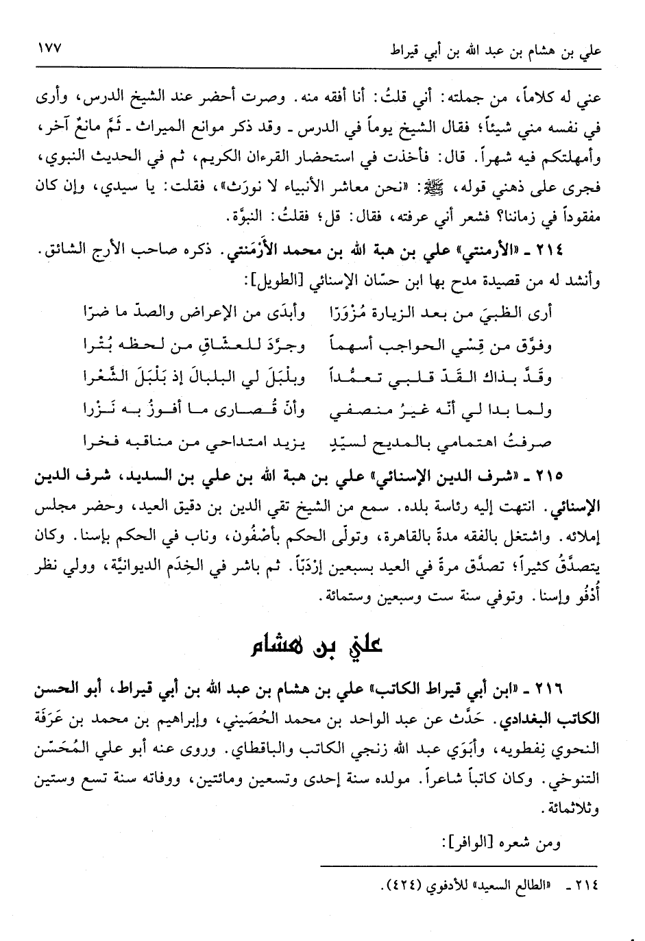 عَليّ بن هِشَام بن عبد الله بن أبي قِيرَاط أَبُو الْحسن الْكَاتِب البغداذي حدَّث عَن عبد الْوَاحِد بن مُحَمَّد الحُصَيني وَإِبْرَاهِيم بن مُحَمَّد بن عَرَفَة النَّحْوِيّ نِفطويه وأبَوَي عبد الله زنجي الْكَاتِب والباقطاي وروى عَنهُ أَبُو عَليّ المحسِّن التنوخي وَكَانَ كَاتبا شَاعِرًا مولده سنة إِحْدَى وَتِسْعين وَمِائَتَيْنِ ووفاته سنة تسع وَسِتِّينَ وَثَلَاث مائَة وَمن شعره