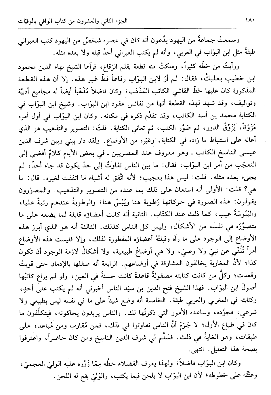 ورأيتُ من خطِّه كثيرا وملكتُ مِنْهُ قِطْعَة بلم الرِّقاع فرآها الشَّيْخ بهاء الدّين مَحْمُود ابْن خطيب بعلبكَّ فَقَالَ لم أرَ لِابْنِ البوَّاب رِقَاعًا قطّ غير هَذِه إلاَّ أنَّ هَذِه الْقطعَة الْمَذْكُورَة كَانَ عَلَيْهَا خطّ القاشي الْكَاتِب المُذَهِّب البوَّاب فَاضلا مُذَهِّباً أَيْضا لَهُ مجاميع أدبيَّة وتواليف وَقد شهد لهَذِهِ الْقطعَة أنَّها من نفائس عُقُود ابْن البوَّاب وَشَيخ ابْن البوَّاب فِي الْكِتَابَة مُحَمَّد بن أَسد الْكَاتِب وَقد تقدَّم ذكره فِي مَكَانَهُ البوَّاب ابْن البوَّاب فِي أوَّل أمره مُزَوِّقاً يُزَوِّقُ الدّور ثمَّ صوَّر الْكتب ثمَّ تعانى الْكِتَابَة قلت التَّصْوِير والتذهيب هُوَ الَّذِي أَعَانَهُ على استنباط مَا زَاده فِي الْكِتَابَة وغيَّره من الأَوضاع وَلَقَد دَار بيني وَبَين شرف الدّين عِيسَى النَّاسِخ الْكَاتِب وَهُوَ مَعْرُوف عِنْد المصريين فِي بعض الْأَيَّام كلامٌ أفْضى إِلَى التعجُّب من أَمر ابْن البوَّاب فَقَالَ مَا بَين النَّاس تفاوتٌ إِلَى حدّ يكون قد جَاءَ أحدٌ لم يجِئ بعده مثله قلت لَيْسَ هَذَا بعجيب لأنَّه اتّفق لَهُ أَشْيَاء مَا اتَّفقت لغيره قَالَ مَا هِيَ قلت الأولى أنَّه اسْتَعَانَ على ذَلِك بِمَا عِنْده من التَّصْوِير والتذهيب والمصوِّرون يَقُولُونَ هَذِه الصُّورَة فِي حركاتها رُطوبةٌ هُنَا ويُبْسٌ هُنَا والرطوبةُ عِنْدهم رتبةٌ عليا واليُبُوسَةُ عيب كَمَا ذَلِك عِنْد الكتَّاب الثَّانِيَة أَنه كَانَت أعضاؤه قَابِلَة لما يَضَعهُ على مَا يتصوَّره فِي نَفسه من الأشكال وَلَيْسَ كل النَّاس كَذَلِك الثَّالِثَة أنَّه هُوَ الَّذِي أبرز هَذِه الأوضاع إِلَى الْوُجُود على مَا رَآهُ وقبلته أعضاؤه المفطورة لذَلِك وإلاّ فَلَيْسَتْ هَذِه الأوضاع أمرا تُلُقِّيَ عَن نبيّ وَلَا وصيّ وَلَا هِيَ أوضاعٌ طبيعيَّة وَلَا أشكالٌ لَازِمَة الْوُجُود أَن تكون كَذَا لأنَّ المغاربة يخالفون المشارقة فِي أوضاعهم الرَّابِعَة أنَّه صقلها بالإدمان حتَّى قويتْ وَقَعَدت وكلُّ من كَانَت كِتَابَته مصقولةً قَاعِدَة كَانَت حَسَنَة فِي الْعين وَلَو لم يراعِ كاتبها أصُول ابْن البوَّاب فَهَذَا الشَّيْخ فتح الدّين بن سيِّد النَّاس أَخْبرنِي أَنه لم يكْتب على أحدٍ وكتابته فِي المغربي والعربي طبقَة الْخَامِسَة أَنه وضع شَيْئا على مَا فِي نَفسه لَيْسَ بطبيعي وَلَا شَرْعِي فجوَّده وساعده الْأُمُور الَّتِي ذكرتُها لَك وَالنَّاس يُرِيدُونَ يحاكونه فيتكلَّفون مَا كَانَ فِي طباع الأول لَا جَرَمَ أنَّ النَّاس تفاوتوا فِي ذَلِك فَمن مُقارب وَمن مُباعد)