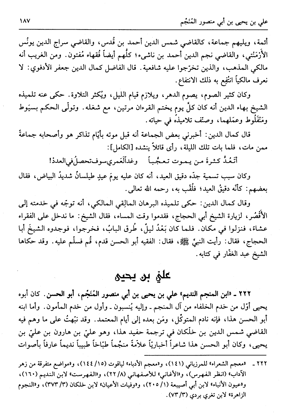 عَليّ بن يحيى بن أبي مَنْصُور المنجِّم أَبُو الْحسن كَانَ أَبوهُ يحيى من خدم الْخُلَفَاء من آل المنجِّم وَإِلَيْهِ يُنسبون وأوَّل من خدم الْمَأْمُون وأمَّا ابْنه أَبُو الْحسن هَذَا فإنَّه نادم المتوكّل ومَن بعده إِلَى أيَّام الْمُعْتَمد وَقد نبّهتُ على مَا وهم فِيهِ القَاضِي شمس الدّين بن خلِّكان فِي تَرْجَمَة حفيد هَذَا وَهُوَ عَليّ بن هَارُون بن عَليّ بن يحيى وَكَانَ أَبُو الْحسن هَذَا شَاعِرًا أخباريًّا علاّمةً منجِّماً طبَّاخاً طَبِيبا نديماً عَارِفًا بِأَصْوَات