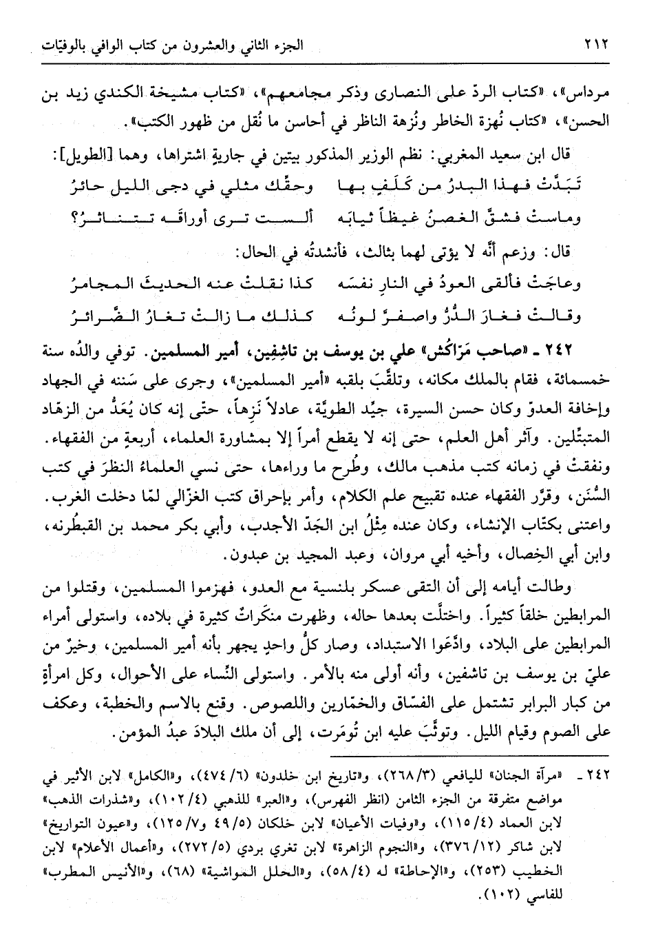 عَليّ بن يُوسُف بن تاشفين أَمِير السلمين توفّي وَالِده سنة خمس مائَة فَقَامَ بِالْملكِ مَكَانَهُ وتلقَّب بلقبه أَمِير الْمُسلمين وَجرى على سنَنه فِي الْجِهَاد وإخافة العدوّ وَكَانَ حسن السِّيرَة جيّد الطويّة عادلاً نزهاً حتَّى إنَّه كَانَ يعدُّ من الزهَّاد المتبتِّلين وآثر أهل الْعم حتَّى إنَّه لَا يقطع أمرا إلاَّ بمشاورة الْعلمَاء أربعةٍ من الْفُقَهَاء ونفقت فِي زَمَانه كتب مَذْهَب مَالك وَطرح مَا وَرَاءَهَا حتَّى نسي الْعلمَاء النّظر فِي كتب السّنَن وقرَّر الْفُقَهَاء عِنْده تقبيح علم الْكَلَام وَأمر بإحراق كتب الْغَزالِيّ لمَّا دخلت الغرب واعتنى بكتَّاب الْإِنْشَاء وَكَانَ عِنْده مثل ابْن الجدّ الأجدب وَأبي بكر مُحَمَّد بن القبطُرنه وَابْن أبي الْخِصَال وأخيه أبي مَرْوَان وَعبد الْمجِيد بن عبدون