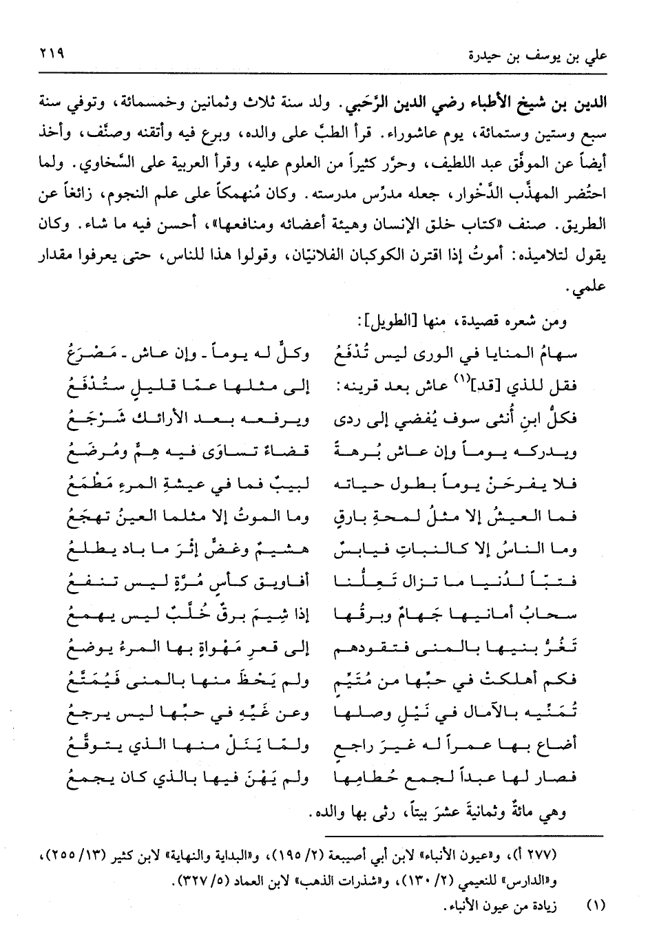 الدّين بن شيخ الأطبَّاء رَضِي الدّين الرَّحَبي ولد سنة ثَلَاث وَثَمَانِينَ وَخمْس مائَة وتوفِّي سنة سبع وَسِتِّينَ وست مائَة يَوْم عَاشُورَاء قَرَأَ الطبَّ على وَالِده وبرع فِيهِ وأتقنه وصنَّف وَأخذ أَيْضا عَن الموفَّق عبد اللَّطِيف وحرَّر كثيرا من الْعُلُوم عَلَيْهِ وَقَرَأَ الْعَرَبيَّة على السَّخاوي ولمَّا احتُضر المهذَّب الدَّخْوار جعله مدرِّس مدرسته وَكَانَ مُنهمكاً على علم النُّجُوم زائغاً عَن الطَّرِيق صنف كتاب خلق الْإِنْسَان وهيئة أَعْضَائِهِ ومنافعها أحسن فِيهِ مَا شَاءَ وَكَانَ يَقُول لتلاميذه أموتُ إِذا اقْترن الكوكبان الفلانيَّان وَقُولُوا هَذَا للنَّاس حتَّى يعرفوا مِقْدَار علمي وَمن شعره قصيدة مِنْهَا سهامُ المنايا فِي الوَرَى لَيْسَ تُدفعُوكلٌّ لَهُ يَوْمًا وَإِن عَاشَ مصرعُ