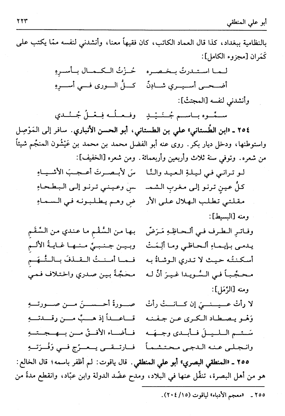 أَبُو عَليّ المنطقي قَالَ ياقوت لم أظفر باسمه قَالَ الخالع هُوَ من أهل الْبَصْرَة تنقَّل عَنْهَا فِي الْبِلَاد ومدح عضُد الدولة وَابْن عبّاد وَانْقطع مُدَّة من