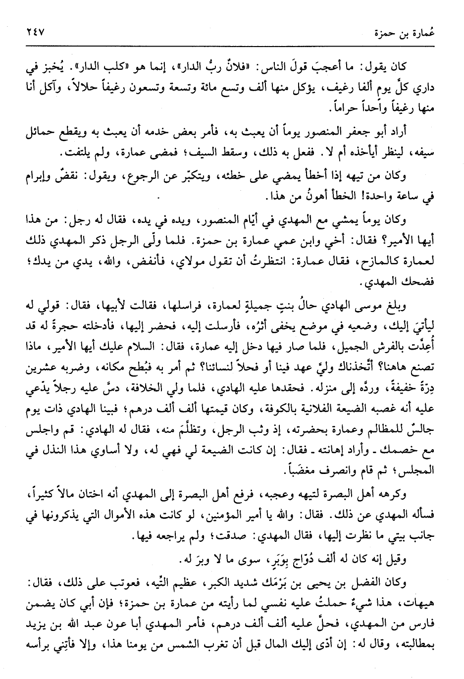 وَكَانَ الْفضل بن يحيى بن برمك شَدِيد الْكبر عَظِيم التيه فعوتب على ذَلِك فَقَالَ هَيْهَات هَذَا شيءٌ حملت عَلَيْهِ نَفسِي لما رَأَيْته من عُمارة بن حمرَة فإنَّ أبي كَانَ يضمن فَارس من الْمهْدي فحلَّ عَلَيْهِ ألف ألف دِرْهَم فَأمر الْمهْدي أَبَا عون عبد الله بن يزِيد بمطالبته وَقَالَ لَهُ إِن أدَّى إِلَيْك المَال قبل أَن تغرب الشَّمْس من يَوْمنَا هَذَا وإلاّ فأتني بِرَأْسِهِ
