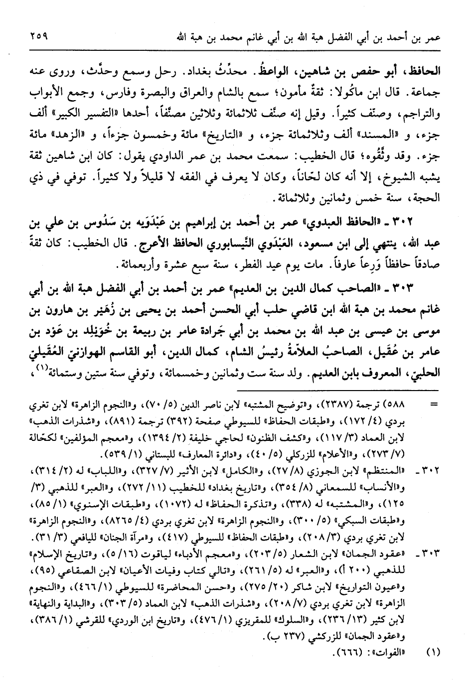 الْحَافِظ أَبُو حَفْص بن شاهين الْوَاعِظ محدِّث بغداذ رَحل وَسمع وحدَّث وروى عَنهُ جمَاعَة قَالَ ابْن ماكُولا ثِقَة مَأْمُون سمع بِالشَّام وَالْعراق وَالْبَصْرَة وَفَارِس وَجمع الْأَبْوَاب والتراجم وصنف كثيرا وَقيل إنَّه صنَّ ثَلَاث مائَة وَثَلَاثِينَ مصنَّفاً أَحدهمَا التَّفْسِير الْكَبِير ألف جُزْء والمسند ألف وَثَلَاث مائَة جُزْء والتاريخ مائَة وَخَمْسُونَ جُزْءا والزهد مائَة جُزْء وَقد وثَّقوه قَالَ الْخَطِيب سَمِعت مُحَمَّد بن عَمْرو الدَّاودِيّ يَقُول كَانَ ابْن شاهين ثِقَة يشبه الشُّيُوخ إلاَّ أنَّه كَانَ لحَّاناً وَكَانَ لَا يعرف فِي الْفِقْه لَا قَلِيلا وَلَا كثيرا