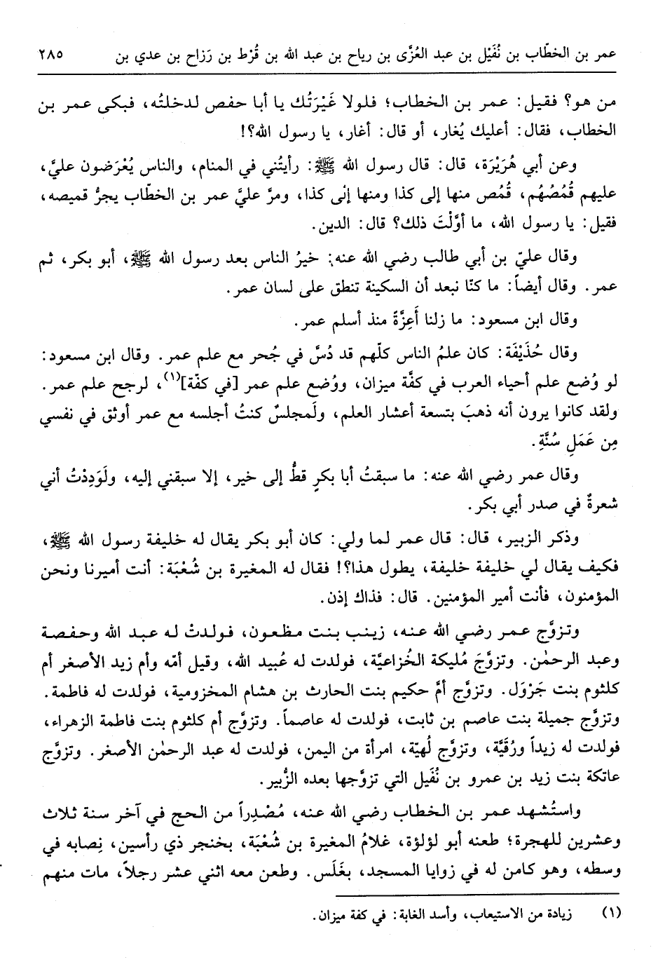 وَقَالَ حُذَيفة كَانَ علمُ النَّاس كلَّهم قد دُسَّ فِي جُحر مَعَ علم عمر وَقَالَ ابْن مَسْعُود لَو وُضع علم أَحيَاء الْعَرَب فِي كفَّة ميزَان ووُضع علم عمر فِي كفَّة لرجح علم عمر وَلَقَد كَانُوا يرَوْنَ أَنه ذهبَ بِتِسْعَة أعشار الْعلم ولَمجلسٌ كنتُ أجلسه مَعَ عمر أوثق فِي نَفسِي من عَمَلِ سنة وَقَالَ عمر رَضِي الله عَنهُ مَا سبقتُ أَبَا بكرٍ قطُّ إِلَى خير إِلاَّ سبقني إِلَيْهِ ولودِدْتُ أنِّي شعرةٌ فِي صدر أبي بكر)