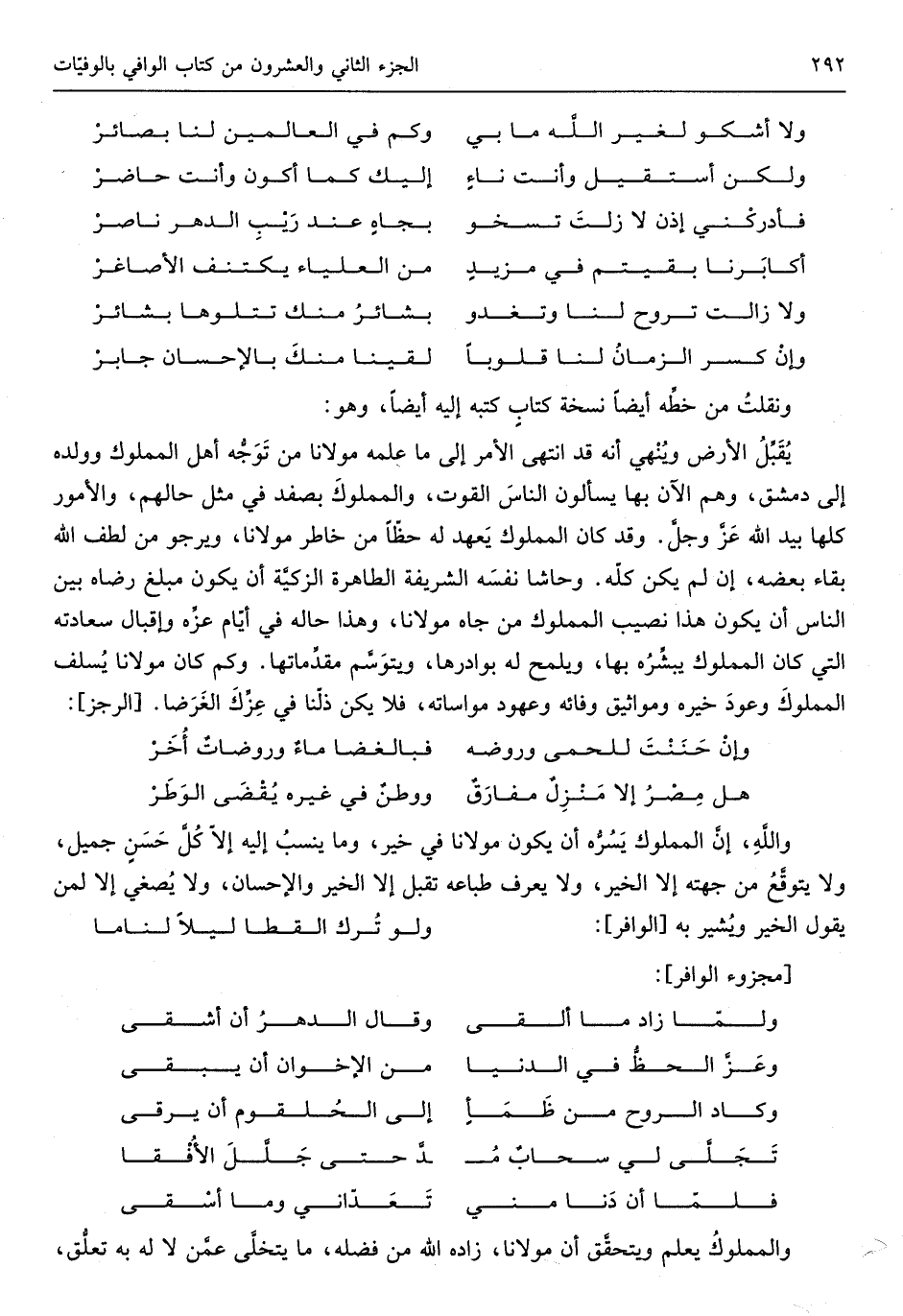 ونقلتُ من خطِّه أَيْضا نُسْخَة كتابٍ كتبه إِلَيْهِ أَيْضا وَهُوَ يُقَبِّلُ الأَرْض ويُنهي أَنه قد انْتهى الْأَمر إِلَى مَا علمه مَوْلَانَا من توجُّه أهل الْمَمْلُوك وَولده إِلَى دمشق وهم الْآن بهَا يسْأَلُون النَّاس الْقُوت والمملوكُ بصفد فِي مثل حَالهم والأمور كلّها بيد الله عزَّ وجلّ وَقد كَانَ الْمَمْلُوك يعْهَد لَهُ حظًّا من خاطر مَوْلَانَا ويرجو من لطف الله بَقَاء بعضه إِن لم يكن كلّه وحاشا نفسَه الشَّرِيفَة الطاهرة أَن يكون مبلغ رِضَاهُ بَين النَّاس أَن يكون هَذَا نصيب الْمَمْلُوك من جاه مَوْلَانَا وَهَذَا حَاله فِي أيَّام عزِّه وإقبال سعادته الَّتِي كَانَ الْمَمْلُوك يبشِّره بهَا ويلمح لَهُ بوادرها ويتوسَّم مقدِّماتها وَكم كَانَ مَوْلَانَا يُسلف المملوكَ وعودَ خَيره ومواثيق وفائه وعهود مواساته فَلَا يكن ذلّنا فِي عِزِّكَ الغَرضا