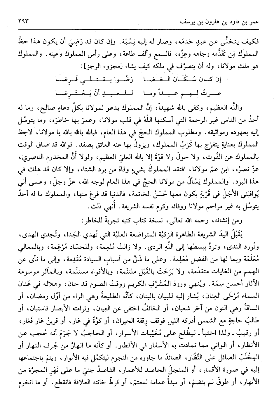 واللهِ الْعَظِيم وَكفى بِاللَّه شَهِيدا إنَّ الْمَمْلُوك يَدْعُو لمولانا بكلِّ دعاءٍ صَالح وَمَا لَهُ أحدٌ من النَّاس غير الرَّحْمَة الَّتِي أسكنها الله فِي قلب مَوْلَانَا وعمَر بهَا خاطره وَمَا يتوَّسل إِلَيْهِ إِلاَّ بعهوده ومواثيقه ومطلوب الْمَمْلُوك الحجّ فِي هَذَا الْعَام فبالله بِاللَّه بِاللَّه يَا مَوْلَانَا لاحظ الْمَمْلُوك بعنايةٍ يتفرَّج بهَا كَرَبُ الْمَمْلُوك ويزولُ عَنهُ العائق بصفد فوَاللَّه قد ضَاقَ الْوَقْت بالمملوك عَن القُوت وَلَا حول وَلَا قوَّة إِلاَّ بِاللَّه العليّ الْعَظِيم وَلَوْلَا أنَّ المخدوم الناصري عزَّ نصرُه ابْن عمّ مَوْلَانَا افْتقدَ المملوكَ بشيءٍ وقاهُ من برد الشتَاء وَإِلَّا كَانَ قد هلك فِي هَذَا الْبرد والمملوك يسْأَل من مَوْلَانَا الحجَّ فِي هَذَا الْعَام لوجه الله عزّ وجلّ وَعَسَى أَن يوافيَني الأجَلُ فِي قُرْبةٍ يكون مَعهَا حسنُ الخاتمة فالدنيا قد فرغ مِنْهَا والمملوك مَا لَهُ أحدٌ يتوسَّل بِهِ غير مراحم مَوْلَانَا ووفائه وكرم نَفسه الشَّرِيفَة أُنهي ذَلِك