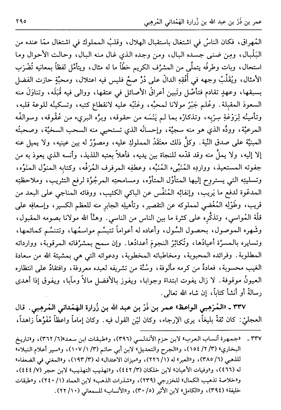 عمر بن ذَرّ بن عبد الله ب زُرارة الهَمْداني المُرْهِبي قَالَ العجليّ كَانَ ثِقَة بليغاً يرى الإرجاء وَكَانَ ليّن القَوْل فِيهِ وَكَانَ إِمَامًا واعظاً مُفَوَّهاً زاهداً