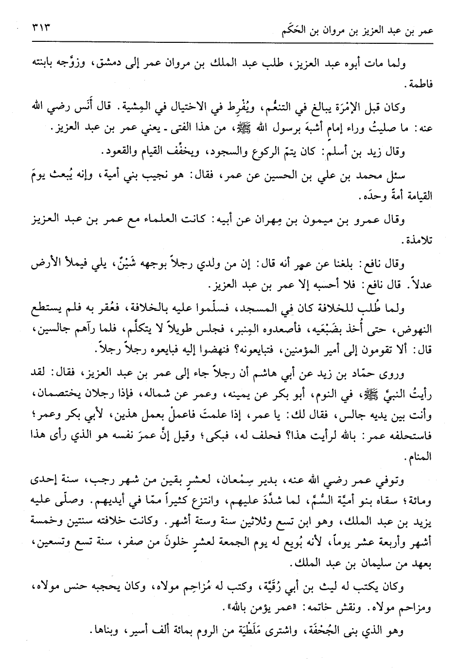 سُئِلَ مُحَمَّد بن عَليّ بن الْحُسَيْن عَن عمر فَقَالَ هُوَ نجيب بني أميَّة وإنَّه يُبعث يَوْم الْقيام أمة وَحده وَقَالَ عَمْرو بن مَيْمُون بن مِهران عَن أَبِيه كَانَت الْعلمَاء مَعَ عمر بن عبد الْعَزِيز تلامذة