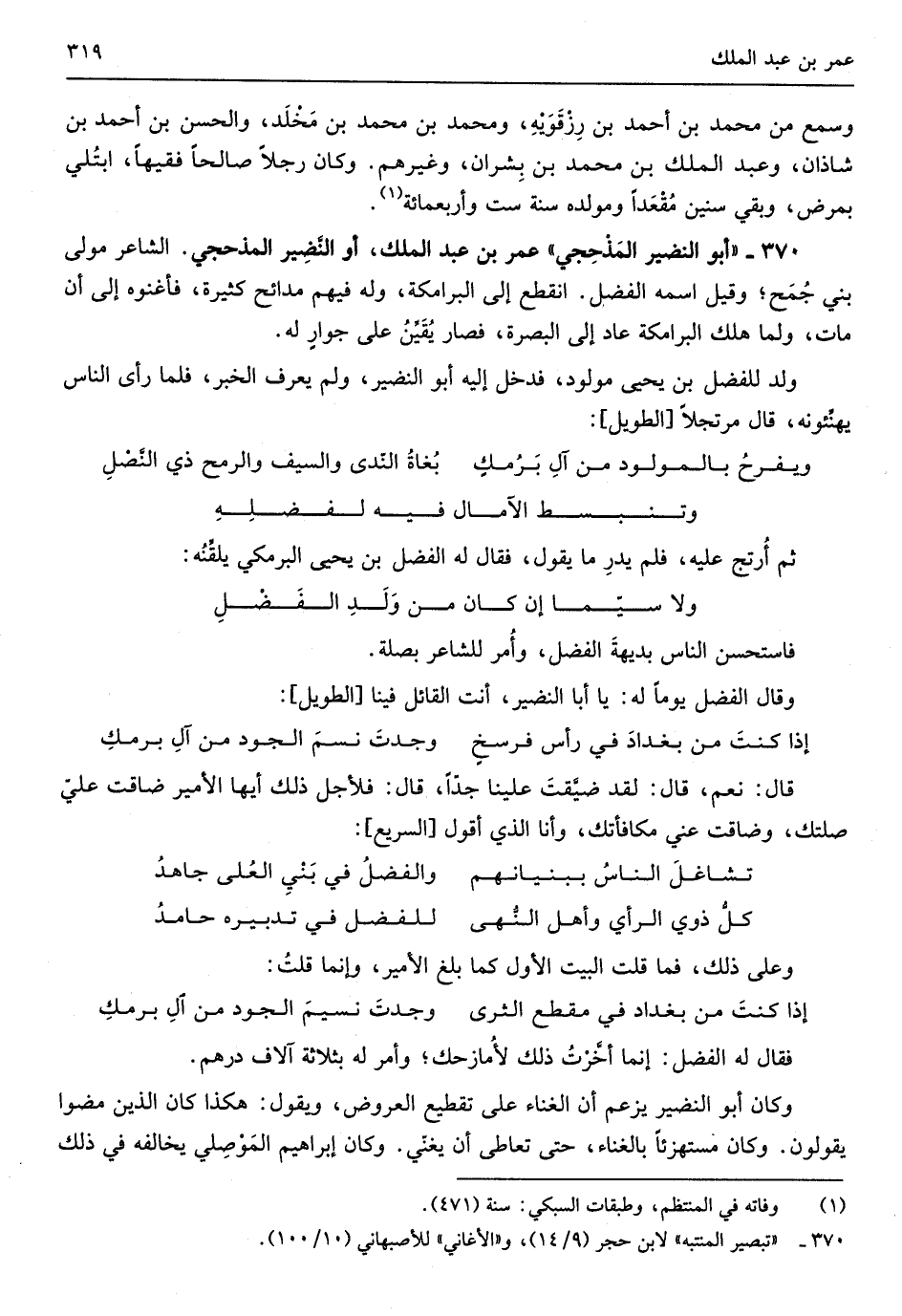 وتنبسط الآمال فِيهِ لفضلِهِ ثمَّ أُرتج عَلَيْهِ فَلم يدرِ مَا يَقُول فَقَالَ لَهُ الْفضل بن يحيى الْبَرْمَكِي يلقِّنه وَلَا سيَّما إِن كَانَ من وَلَدِ الفضلِ فَاسْتحْسن النَّاس بديهة الْفضل وأُمر للشاعر بصلَة وَقَالَ الْفضل يَوْمًا لَهُ يَا أَبَا النَّضير أَنْت الْقَائِل فِينَا