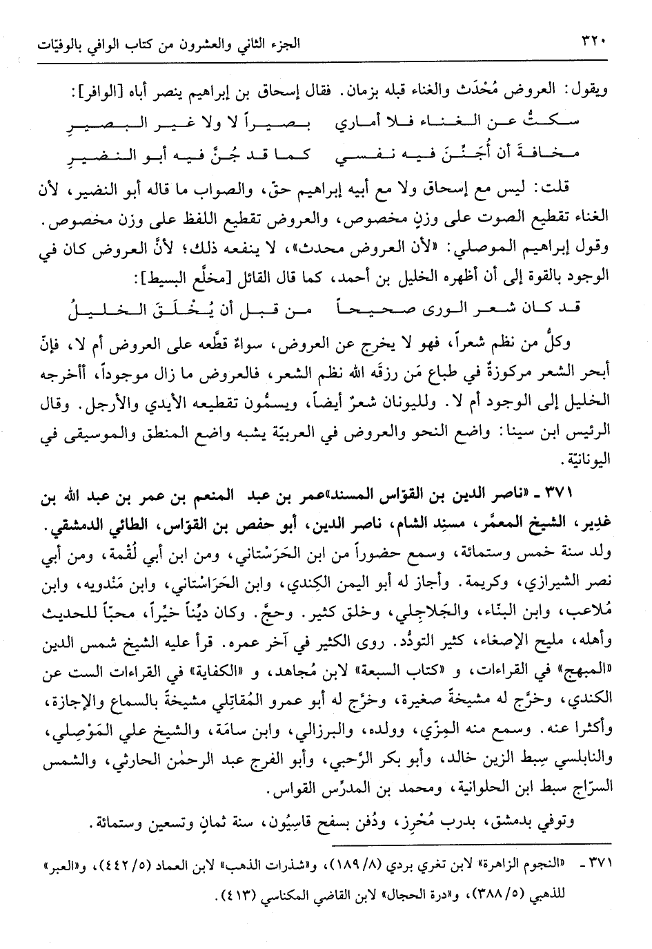 قلت لَيْسَ مَه إِسْحَاق وَلَا مَعَ أَبِيه إِبْرَاهِيم حقّ وَالصَّوَاب مَا قَالَه أَبُو النَّضير لأنَّ الْغناء تقطيع الصَّوْت على وزنٍ مَخْصُوص وَالْعرُوض تقطيع اللَّفْظ على وزن مَخْصُوص وَقَول إِبْرَاهِيم الْموصِلِي لأنَّ الْعرُوض مُحدث لَا يَنْفَعهُ ذَلِك لأنَّ الْعرُوض كَانَ فِي الْوُجُود بالقوَّة إِلَى أَن أظهره الْخَلِيل بن أَحْمد كَمَا قَالَ الْقَائِل