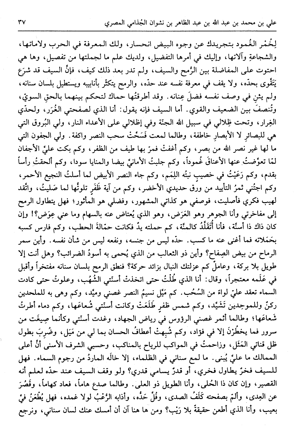 لخمر الغمود بتجريدك عَن وُجُوه الْبيض انحسار وَلَك الْمعرفَة فِي الْحَرْب ولاماتها والشجاعة وآلاتها وَإِلَيْك فِي أمرهَا التَّفْضِيل ولديك علم مَا لجملتها من تَفْصِيل وَهَا هِيَ احتوت على المفاضلة بَين الرُّمح وَالسيف وَلم تدر بعد ذَلِك كَيفَ فإنَّ السَّيْف قد شرَع يَتَقوَّى بحدّه وَلَا يقف بِمَعْرِِفَة نَفسه عِنْد حدّه وَالرمْح يتكثّر بأنابيبه ويستطيل بِلِسَان سنانه وَلم يثنِ فِي وصف نَفسه فضلَ عِنانه وَقد أطرقتُها حماك لتَحكم بَينهمَا بالحقِّ السويّ وتُنصف بَين الضَّعِيف وَالْقَوِي أمَّا السَّيْف فإنَّه يَقُول أَنا الَّذِي لصفحتي الغُرَر ولحدِّي الغِرار وَتَحْت ظِلالي فِي سَبِيل الله الجنَّة وَفِي إظلالي على الأَعداء النَّار ولي البُروق الَّتِي هِيَ للبصائرِ لَا الأَبصارِ خاطفة وطالما لمعت فَسَحَّتْ سحب النَّصْر واكفة ولي الجفون الَّتِي مَا لَهَا غير نصر الله من بصر وَكم أغفت فمرَّ بهَا طيف من الظفر وَكم بَكت عليَّ الأَجفان لمَّا تعوَّضتُ عَنْهَا الأَعناقَ عُمودا وَكم جلبتُ الْأَمَانِي بيضَ والمنايا سُودًا وَكم ألحقتُ رَأْسا بقدم وَكم رعيت فِي خصيبٍ نبته اللّمم وَكم جَاءَ النَّصْر الْأَبْيَض لما أسلتُ النجيع الْأَحْمَر وَكم اجتُني ثَمَر التأييد من ورق حديدي الْأَخْضَر وَكم من آيَة ظفرٍ تلوتها لمَّا صلَّيتُ واتَّقد لهيب فكري فأصليت فوصفي هُوَ كذاتي الْمَشْهُور وفضلي هُوَ الْمَأْثُور فَهَل يَتَطَاوَل الرمْح إِلَى مفاخرتي وَأَنا الْجَوْهَر وَهُوَ الْعرض وَهُوَ الَّذِي يُعتاض عَنهُ بِالسِّهَامِ وَمَا عنِّي عوض وَإِن كَانَ ذَاك ذَا أسنَّة فَأَنا أُتَقَلَّدُ كالمِنَّة كم حَملته يدٌ فَكَانَت حمَّالة الْحَطب وَكم فَارس كَسبه بحَمَلاته فَمَا أغْنى عَنهُ مَا كسب حدّه لَيْسَ من جنسه ونفعه لَيْسَ من شَأْن نَفسه وَأَيْنَ سمر الرماح من بيض الصّفاح وَأَيْنَ ذُو الثعالب من الَّذِي يُحمى بِهِ أُسود الضرائب وَهل أَنْت إلاَّ طَوِيل بِلَا بركَة وعاملٌ كم عزلتك النبال بزائد حَرَكَة فَنَطَقَ الرمْح بِلِسَان سنانه مفتخراً وَأَقْبل فِي علمه)