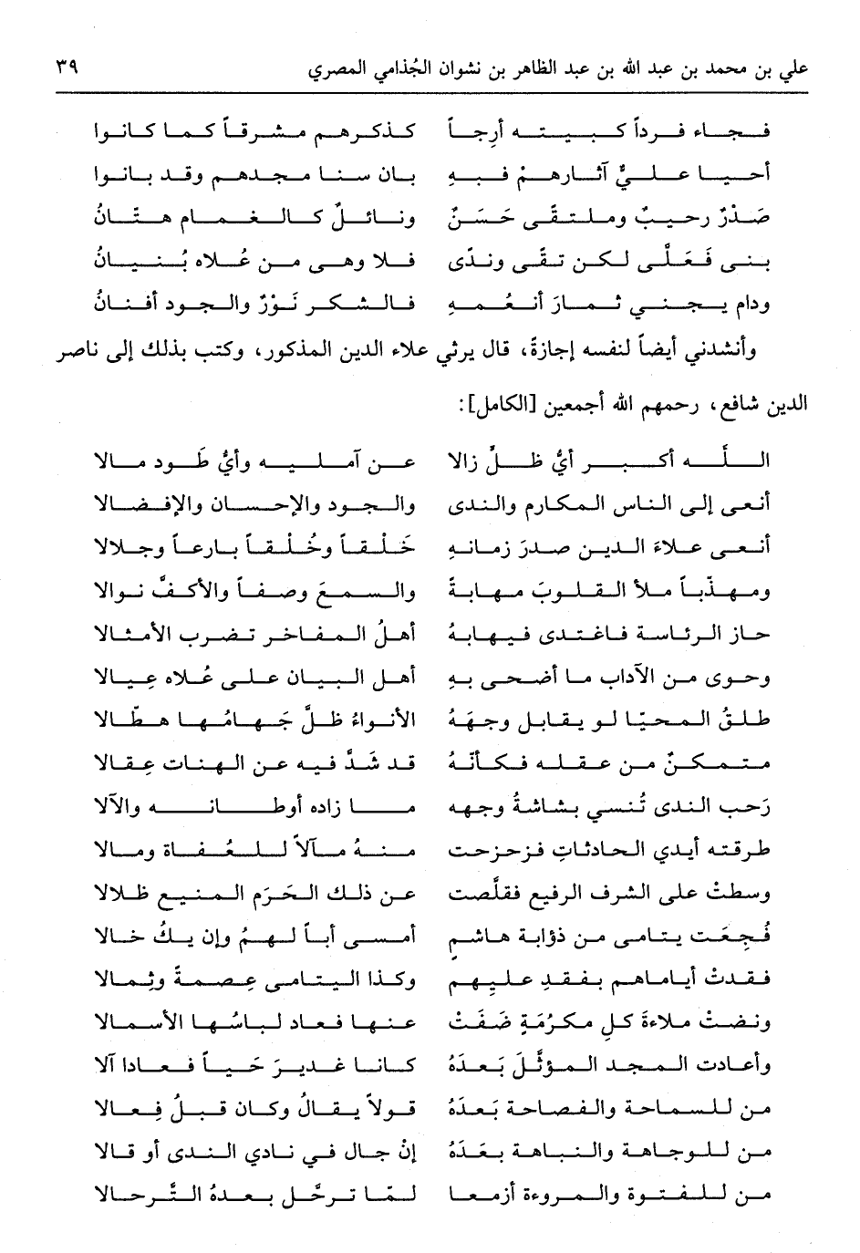 وأنشدني أَيْضا لنَفسِهِ إجَازَة قَالَ يرثي عَلَاء الدّين الْمَذْكُور وَكتب بذلك إِلَى نَاصِر الدّين شَافِع رَحِمهم الله أَجْمَعِينَ