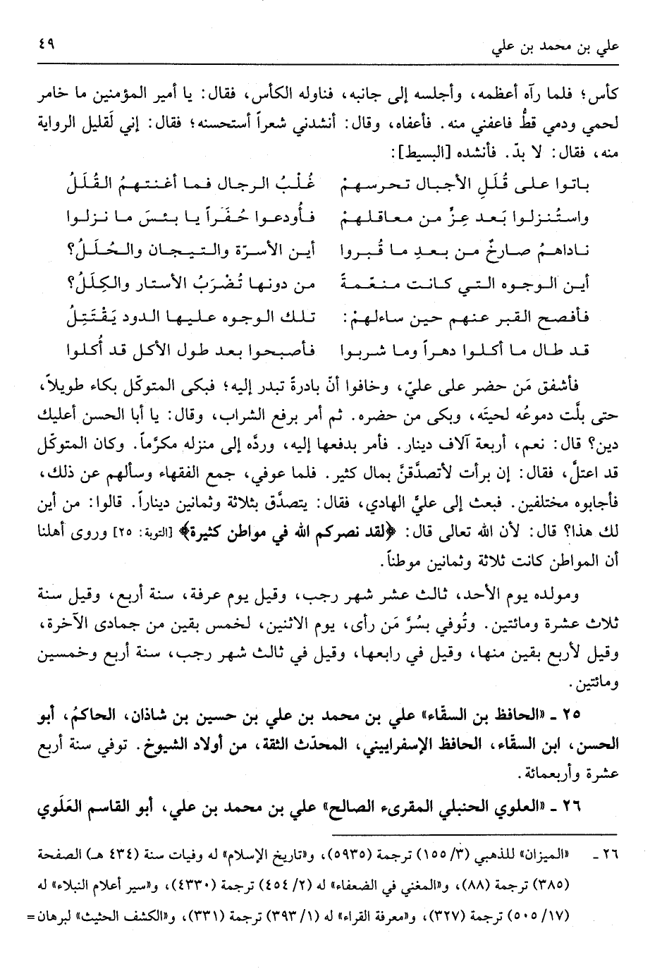 فأشفق من حضر على عليّ وخافوا أنَّ بادرةً تبدر إِلَيْهِ فَبكى المتوكّل بكاء طَويلا حتَّى بلَّت دُمُوعه لحيته وَبكى من حَضَره ثمَّ أَمر بِرَفْع الشَّرَاب وَقَالَ يَا أَبَا الْحسن أعليك دين قَالَ نعم أَرْبَعَة آلَاف دِينَار فَأمر بدفعها إِلَيْهِ وردَّه إِلَى منزله مكرَّماً وَكَانَ المتوكّل قد اعتلَّ فَقَالَ إِن برأت لأتصدَّقنَّ بِمَال كثير فلمَّا عوفي جمع الْفُقَهَاء وسألهم عَن ذَلِك فَأَجَابُوهُ مُخْتَلفين فَبعث إِلَى عليٍّ الْهَادِي فَقَالَ يتصدَّق بِثَلَاثَة وَثَمَانِينَ دِينَارا قَالُوا من أَيْن لَك هَذَا قَالَ لأنَّ الله تَعَالَى قَالَ لقد نصركم الله فِي مَوَاطِن كَثِيرَة وروى أهلنا أَن المواطن كَانَت ثَلَاث وَثَمَانِينَ موطناً ومولده يَوْم الْأَحَد ثَالِث عشر شهر رَجَب وَقبل يَوْم عَرَفَة سنة أَربع وَقيل سنة ثَلَاث عشرَة وَمِائَتَيْنِ وتُوفي بسرَّ من رأى يَوْم الِاثْنَيْنِ لخمس بَقينَ من جُمَادَى الْآخِرَة وَقيل لأَرْبَع بَقينَ مِنْهَا وَقيل فِي رَابِعهَا وَقيل فِي ثَالِث شهر رَجَب سنة أَربع وَخمسين وَمِائَتَيْنِ