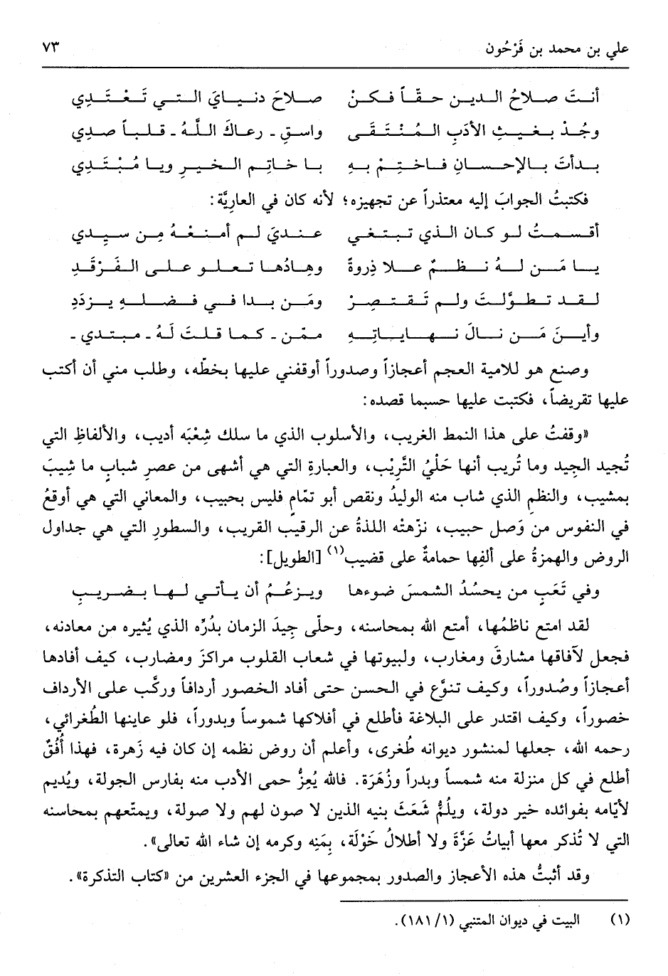 وأينَ من نَالَ نهاياتِهِممّن كَمَا قلتَ لَهُ مبتدي وصنع هُوَ للامية الْعَجم أعجازاً وصدوراً أوقفني عَلَيْهَا بِخَطِّهِ وَطلب مني أَن أكتب عَلَيْهَا تقريضاً فَكتبت عَلَيْهَا حَسْبَمَا قَصده وقفتُ على هَذَا النمط الْغَرِيب والأسلوب الَّذِي مَا سلك شِعبه أديب والألفاظ الَّتِي تجيد الْجيد وَمَا تُريب أَنَّهَا حَلْيُ التَّريب والعبارة الَّتِي هِيَ أشهى من عصر شبابٍ مَا شيب بمشيب وَالنّظم الَّذِي شَاب مِنْهُ الْوَلِيد وَنقص أَبُو تمامٍ فَلَيْسَ بحبيب والمعاني الَّتِي هِيَ أوقع فِي النُّفُوس من وصل حبيب نزّهتْه اللذةُ عَن الرَّقِيب الْقَرِيب والسطور الَّتِي هِيَ جداول الرَّوْض والهمزةُ على ألفها حمامةٌ على قضيب