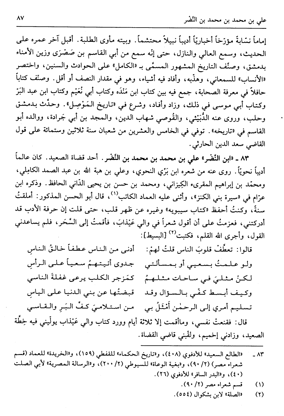 عَليّ بن مُحَمَّد بن مُحَمَّد بن النَّضر أحد قُضَاة الصَّعِيد كَانَ عَالما أديباً نحويًّا روى عَنهُ من شعره ابْن بَرِّي النَّحْوِيّ وَعلي بن هبة الله بن عبد الصَّمد الكاملي وَمُحَمّد بن إِبْرَاهِيم الْمُقْرِئ الكِيزاني وَمُحَمّد بن حسن بن يحيى الدَّاني الْحَافِظ وَذكره ابْن عرَّام فِي سيرة بني الْكَنْز وَأثْنى عَلَيْهِ الْعِمَاد الْكَاتِب قَالَ أَبُو الْحسن الْمَذْكُور أملقتُ سنة وَكنت أحفظ كتاب سِيبَوَيْهٍ وَغَيره عَن ظهر قلب حتَّى قلت إنَّ حِرْفَة الأَدب قد أدركتني فعزمتُ على أَن أَقُول شعرًا فِي وَالِي عَيْذابَ فأقمت إِلَى السَّحَر فَلم يساعدني القَوْل وأجرى الله الْقَلَم فَكتبت