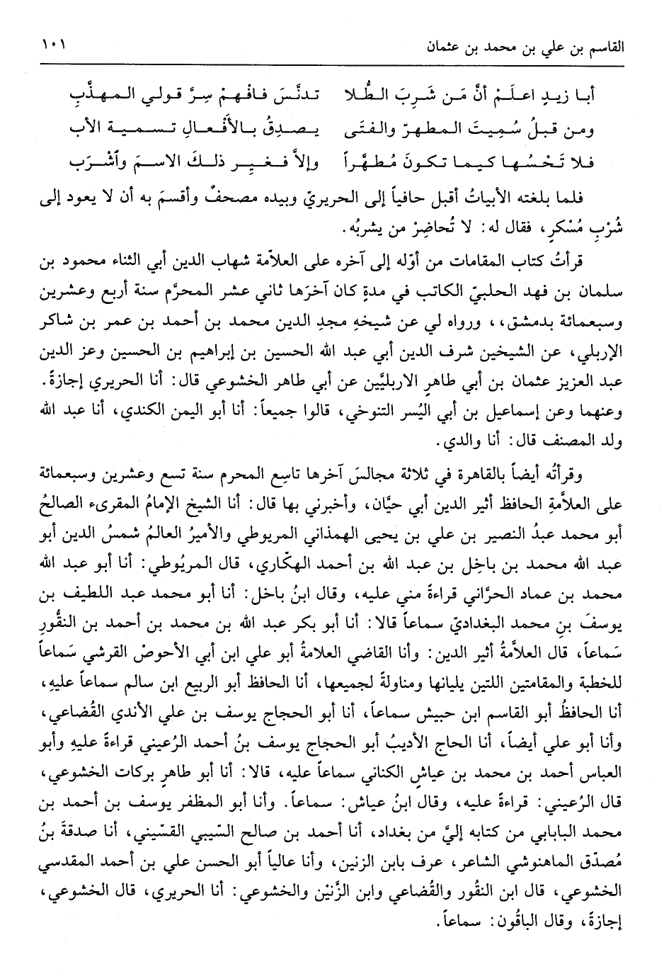 الله مُحَمَّد بن باخل بن عبد الله بن أَحْمد الهكاري قَالَ المريوطي أَنا أَبُو عبد الله مُحَمَّد بن عماد الْحَرَّانِي قِرَاءَة مني عَلَيْهِ وَقَالَ ابْن باخل أَنا أَبُو مُحَمَّد عبد اللَّطِيف بن يُوسُف بن مُحَمَّد الْبَغْدَادِيّ سَمَاعا قَالَا أَنا أَبُو بكر عبد الله بن مُحَمَّد بن أَحْمد بن القنور سَمَاعا قَالَ الْعَلامَة أثير الدّين وَأَنا القَاضِي الْعَلامَة أَبُو عَليّ ابْن أبي الْأَحْوَص الْقرشِي سَمَاعا للخطبة والمقامتين اللَّتَيْنِ يليانها ومناولة لجميعها أَنا الْحَافِظ أَبُو الرّبيع ابْن سَالم سَمَاعا عَلَيْهِ أَنا الْحَافِظ أَبُو الْقَاسِم ابْن حُبَيْش سَمَاعا أَنا أَبُو الْحجَّاج يُوسُف بن عَليّ الأندي الْقُضَاعِي وَأَنا أَبُو عَليّ أَيْضا أَنا الْحَاج الأديب أَبُو الْحجَّاج يُوسُف بن أَحْمد الرعيني قِرَاءَة عَلَيْهِ وَأَبُو الْعَبَّاس أَحْمد بن مُحَمَّد بن عَيَّاش الْكِنَانِي سَمَاعا عَلَيْهِ قَالَا أَنا أَبُو طَاهِر بَرَكَات الخشوعي قَالَ الرعيني قِرَاءَة عَلَيْهِ وَقَالَ ابْن عَيَّاش سَمَاعا وَأَنا أَبُو المظفر يُوسُف بن أَحْمد بن مُحَمَّد البابابي من كِتَابه إِلَيّ من بَغْدَاد أَنا أَحْمد بن صَالح السيبي القسيني أَنا صَدَقَة بن مُصدق الماهنوشي الشَّاعِر عرف بِابْن الزنين وَأَنا عَالِيا أَبُو الْحسن عَليّ بن أَحْمد الْمَقْدِسِي الخشوعي قَالَ ابْن القنور والقضاعي وَابْن الزنين والخشوعي أَنا الحريري قَالَ الخشوعي إجَازَة وَقَالَ الْبَاقُونَ سَمَاعا