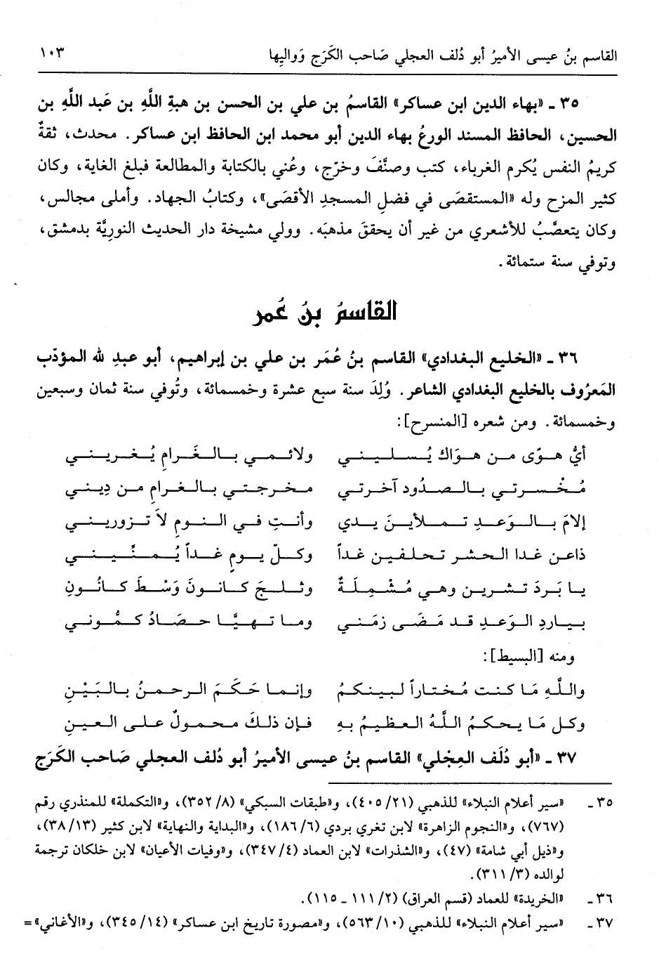 الْقَاسِم بن عمر بن عَليّ بن إِبْرَاهِيم أَبُو عبد الله الْمُؤَدب الْمَعْرُوف بالخليع الْبَغْدَادِيّ الشَّاعِر ولد سنة سبع عشرَة وَخَمْسمِائة وَتُوفِّي سنة ثَمَان وَسبعين وَخَمْسمِائة