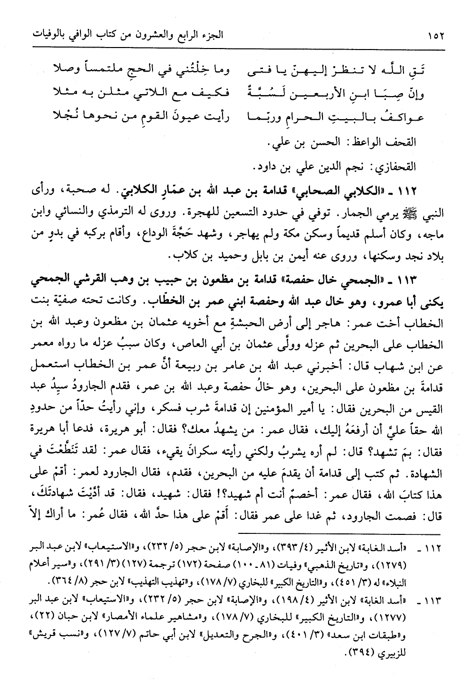 قدامَة بن عبد الله بن عمار الْكلابِي لَهُ صُحْبَة وَرَأى النَّبِي صلى الله عَلَيْهِ وَسلم يَرْمِي الْجمار توفّي فِي حُدُود التسعين لِلْهِجْرَةِ