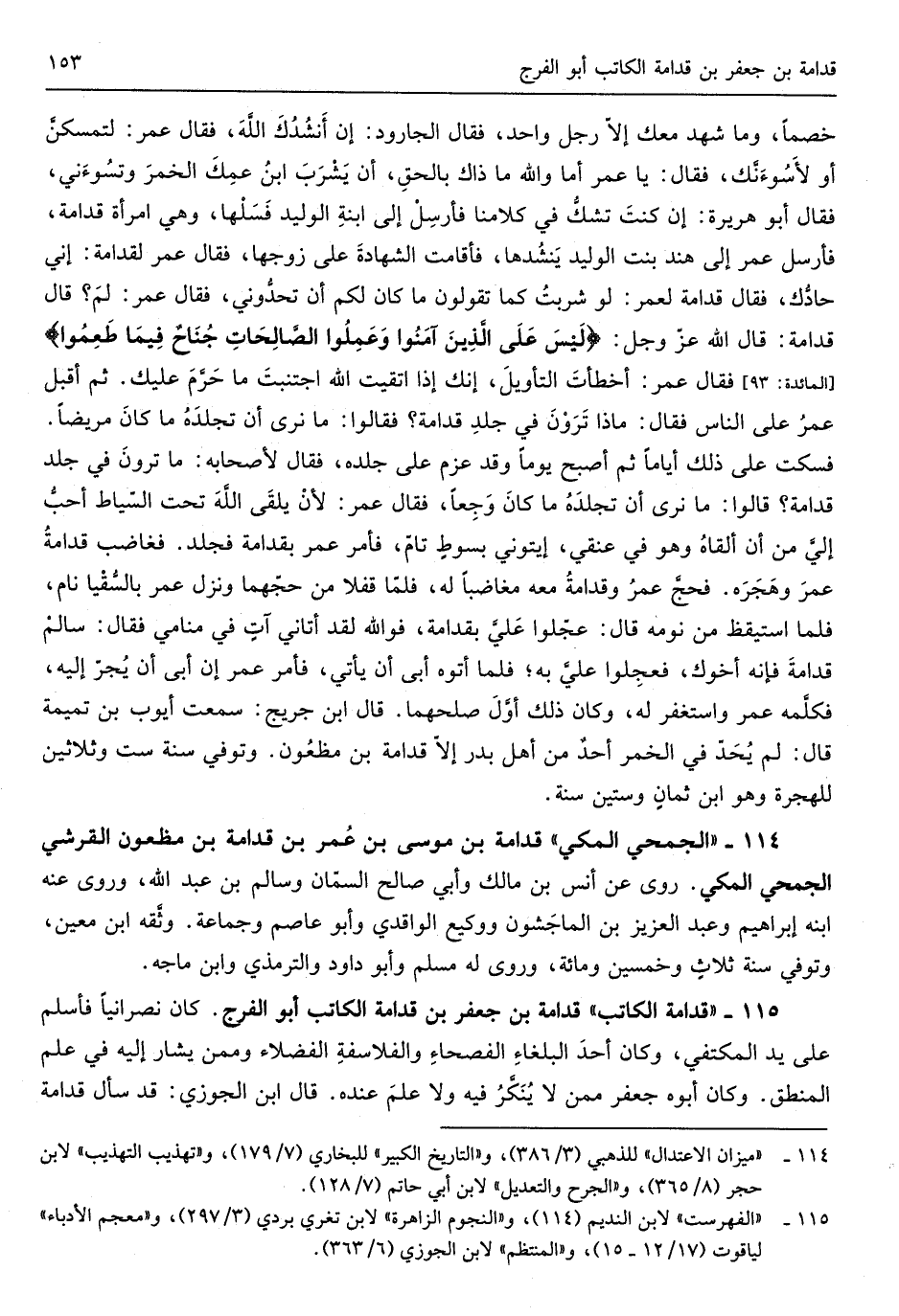 قدامَة بن جَعْفَر بن قدامَة الْكَاتِب أَبُو الْفرج كَانَ نَصْرَانِيّا فَاسْلَمْ على يَد المكتفي وَكَانَ أحد البلغاء الفصحاء والفلاسفة وَمِمَّنْ يشار غليه فِي علم الْمنطق