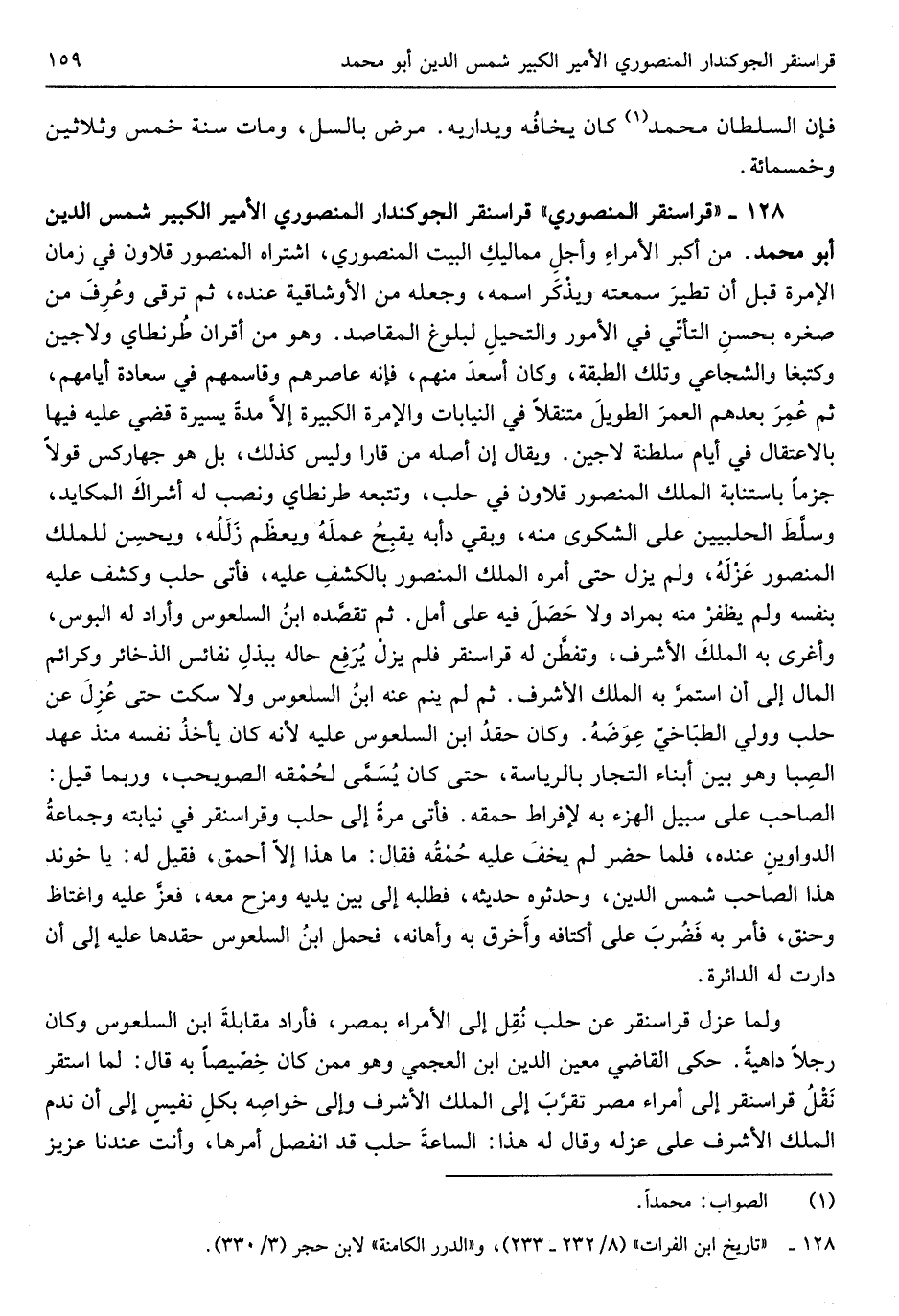 حكى لي القَاضِي معِين الدّين ابْن العجمي وَهُوَ مِمَّن كَانَ خصيصاً بِهِ قَالَ لم اسْتَقر نقل قراسنقر إِلَى أُمَرَاء مصر تقرب إِلَى الْملك الْأَشْرَف وَإِلَى خواصه بِكُل نَفِيس إِلَى أَن نَدم الْملك الْأَشْرَف على عَزله وَقَالَ لَهُ هَذَا السَّاعَة حلب قد انْفَصل أمرهَا وَأَنت عندنَا عَزِيز