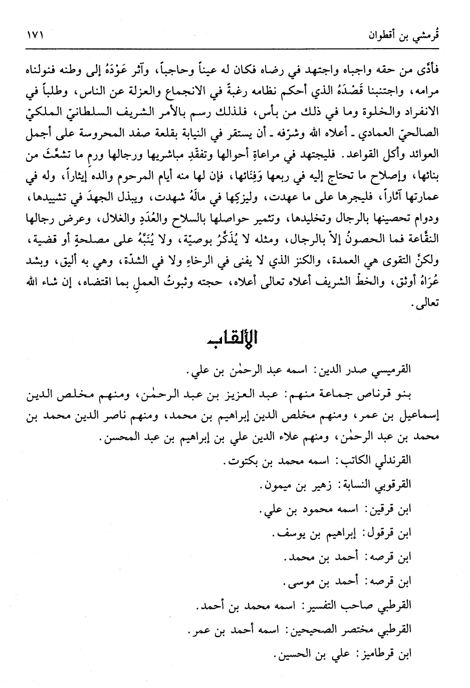 تحْتَاج إِلَيْهِ فِي ربعهَا وفنائها فَإِن لَهَا مِنْهُ أَيَّام المرحوم وَالِده إيثاراً وَله فِي عمارتها آثاراً فليجرها على مَا عهِدت وليزكها فِي مَاله شهِدت ويبذل الْجهد فِي تشييدها ودوام تحصينها بِالرِّجَالِ وتخليدها وتثمير حواصلها بِالسِّلَاحِ وَالْعدَد والغلال وَعرض رجالها النقاعة فَمَا الْحُصُون إِلَّا بِالرِّجَالِ وَمثله لَا يذكر بِوَصِيَّة وَلَا يُنَبه على مصلحَة اَوْ قَضِيَّة وَلَكِن التَّقْوَى هِيَ الْعُمْدَة والكنز الَّذِي لَا يفنى فِي الرخَاء وَلَا فِي الشدَّة وَهِي بِهِ أليق وبشد عراه أوثق والخط الشريف أَعْلَاهُ تَعَالَى اعلاه حجَّته وَثُبُوت الْعَمَل بِمَا اقْتَضَاهُ إِن شَاءَ الله تَعَالَى