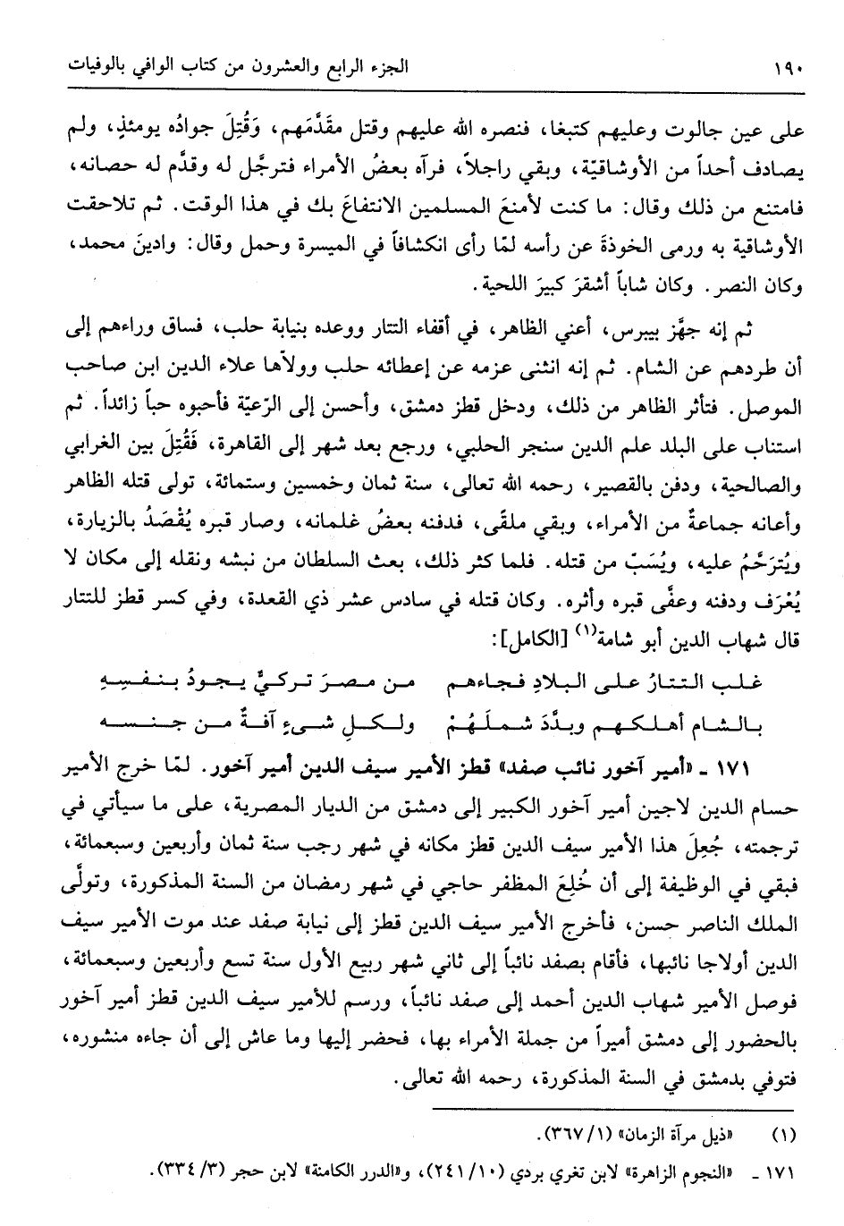 قطز الْأَمِير سيف الدّين أَمِير آخور لما خرج الْأَمِير حسام الدّين لاجين أَمِير آخور الْكَبِير إِلَى دمشق من الديار المصرية على مَا سَيَأْتِي فِي تَرْجَمته جعل هَذَا الْأَمِير سيف الدّين قطز مَكَانَهُ فِي شهر رَجَب سنة ثَمَان وَأَرْبَعين وَسَبْعمائة فَبِي فِي الْوَظِيفَة إِلَى أَن خلع المظفر حاجي فِي شهر رَمَضَان من السّنة الْمَذْكُورَة وَتَوَلَّى الْملك النَّاصِر حسن فَأخْرج الْأَمِير سيف الدّين قطز إِلَى نِيَابَة صفد عِنْد موت الْأَمِير سيف الدّين أولاجا نائبها فَأَقَامَ بصفد نَائِبا إِلَى ثَانِي شهر ربيع الأول سنة تسع وَأَرْبَعين وَسَبْعمائة فوصل الْأَمِير شهَاب الدّين أَحْمد إِلَى صفد نَائِبا ورسم للأمير سيف الدّين قطز أَمِير آخور بالحضور إِلَى دمشق أَمِيرا من جملَة الْأُمَرَاء بهَا فَحَضَرَ إِلَيْهَا وَمَا عَاشَ إِلَى أَن)