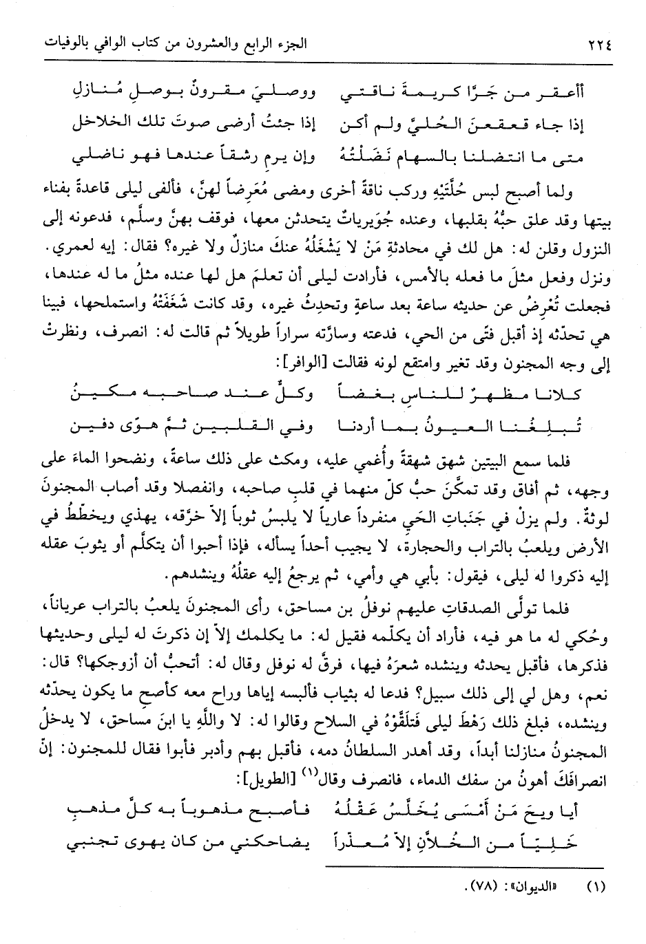 فَلَمَّا سمع الْبَيْتَيْنِ شهق شهقة وأغمي عَلَيْهِ وَمكث على ذَلِك سَاعَة ونضحوا المَاء على وَجهه ثمَّ أَفَاق وَقد تمكن حل كل مِنْهُمَا فِي قلب صَاحبه وانفصلا وَقد أصَاب الْمَجْنُون لوثة