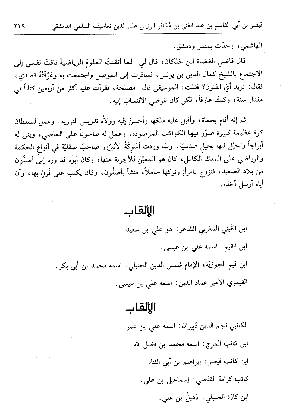 قَالَ قَاضِي الْقُضَاة ابْن خلكان قَالَ لي لما أتقنت الْعُلُوم الرياضية تاقت نَفسِي إِلَى الِاجْتِمَاع بالشيخ كَمَال الدّين بن يُونُس فسافرت إِلَى الْموصل وَاجْتمعت بِهِ وعرفته قصدي فَقَالَ تُرِيدُ أَي الْفُنُون فَقلت الموسيقى قَالَ مصلحَة فَقَرَأت عَلَيْهِ أَكثر من أَرْبَعِينَ كتابا فِي مِقْدَار سنة وَكنت عَارِفًا لَكِن كَانَ غرضي الانتساب إِلَيْهِ