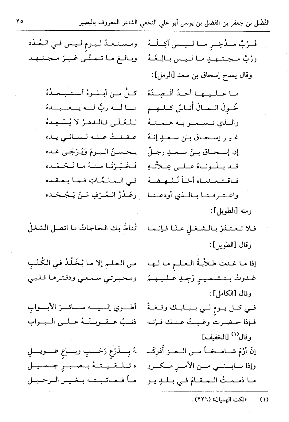 وَقَالَ إِن أرم شامخا من الْعِزّ أدْركهُ بذرعٍ رحبٍ رباعٍ طَوِيل وَإِذا نابني من الْأَمر مَكْرُوه تلقيته بصبر جميل مَا ذممت الْمقَام فِي بلد يَوْمًا فعاتبته بِغَيْر الرحيل
