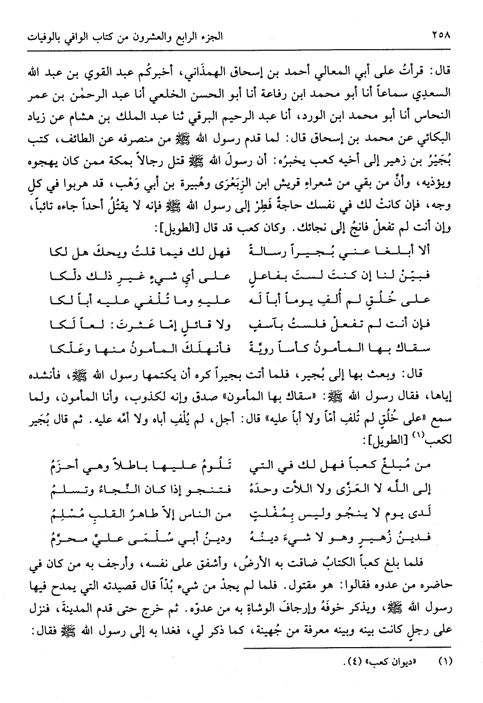 قَالَ قَرَأت على أبي الْمَعَالِي أَحْمد بن إِسْحَاق الهمذاني أخْبركُم عبد الْقوي بن عبد الله السَّعْدِيّ سَمَاعا أَنا أَبُو مُحَمَّد ابْن رِفَاعَة أَنا أَبُو الْحسن الخلعي أَنا عبد الرَّحْمَن بن عمر النّحاس أَنا أَبُو مُحَمَّد ابْن الْورْد أَنا عبد الرَّحِيم البرقي ثَنَا عبد الْملك بن هِشَام عَن زِيَاد البكائي عَن مُحَمَّد بن إِسْحَاق قَالَ لما قدم النَّبِي صلى الله عَلَيْهِ وَسلم من مُنْصَرفه عَن الطَّائِف كتب بجير بن زُهَيْر إِلَى أَخِيه كَعْب يُخبرهُ أَن رَسُول الله صلى الله عَلَيْهِ وَسلم قتل رجَالًا بِمَكَّة مِمَّن كَانَ يهجوه ويؤذيه وَأَن من بَقِي من شعراء قُرَيْش ابْن الزِّبَعْرَى وهبيرة بن أبي وهب قد هربوا فِي كل وَجه فَإِن كنت لَك فِي نَفسك حَاجَة فطر إِلَى رَسُول الله صلى الله عَلَيْهِ وَسلم فَإِنَّهُ لَا يقتل أحدا جَاءَهُ تَائِبًا وَإِن أَنْت لم تفعل فَانْجُ إِلَى نجائك