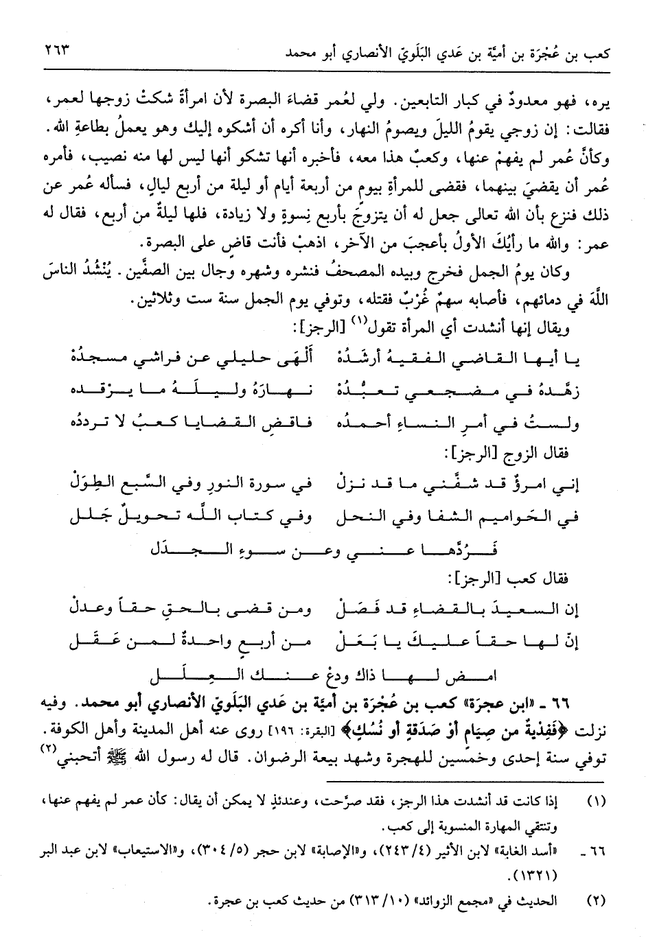 كَعْب بن عجْرَة بن أُميَّة بن عدي البلوي الْأنْصَارِيّ أَبُو مُحَمَّد وَفِيه نزلت ففدية من صِيَام أَو صَدَقَة أَو نسك روى عَنهُ أهل الْمَدِينَة وَأهل الْكُوفَة