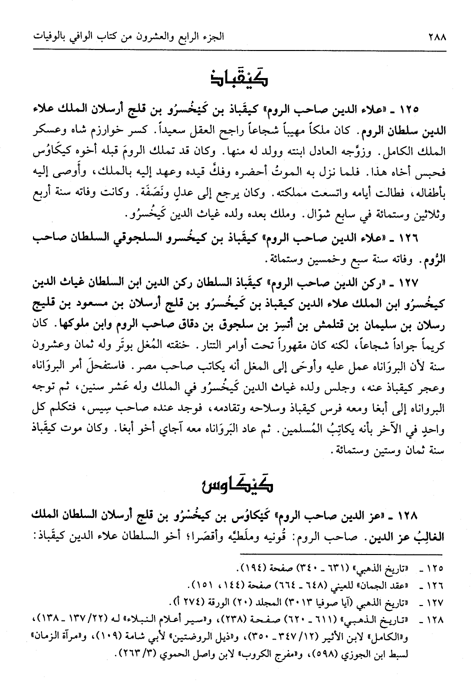 كيقباذ بن كيخسرو بن قلج أرسلان الْملك عَلَاء الدّين سُلْطَان الرّوم كَانَ ملكا مهيباً شجاعاً رَاجِح الْعقل سعيداً