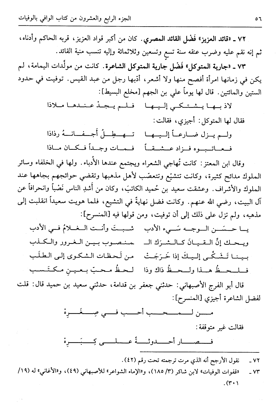 قَالَ أَبُو الْفرج الْأَصْبَهَانِيّ حَدثنِي جَعْفَر بن قدامَة حَدثنِي سعيد بن حميد قَالَ قلت لفضل الشاعرة أجيزي)