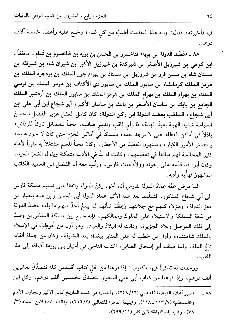 فناخسرو بن الْحسن بن بويه بن فناخسرو بن تَمام مخففاً ابْن كوهي بن شيرزيل الْأَصْغَر بن شيركدة بن شيرزيل الْأَكْبَر بن شيران شاه بن شيرفنه بن سستان شاه بن سسن فرو بن شروزيل ابْن سسناذ بن بهْرَام جور الْملك بن يزدجرد الْملك بن هُرْمُز الْملك كرمانشاه بن سَابُور الملمك بن سَابُور ذِي الأكتاف بن هُرْمُز الْملك بن نرسي الْملك بن بهْرَام الْملك بن بهْرَام الْملك بن هُرْمُز الْملك بن سَابُور الْملك بن أردشير الْملك الْجَامِع بن بابك بن ساسان الْأَصْغَر بن بابك بن ساسان الْأَكْبَر أَبُو شُجَاع ابْن أبي عَليّ ابْن أبي شُجَاع الملقب بعضد الدولة ابْن ركن الدولة كَانَ كَامِل الْعقل غزير الْفضل حسن السياسة شَدِيد الهيبة بعيد الهمة ذَا رَأْي ثاقب وتدبير صائب محباً للفضائل تاركاًُ للرذائل باذلاً فِي أَمَاكِن الْعَطاء حَتَّى لَا يُوجد بعده ممسكاً فِي أَمَاكِن الحزم حَتَّى كَأَن لَا جود عِنْده يستصغر الْأُمُور الْكِبَار ويستهون الْعَظِيم من الأخطار