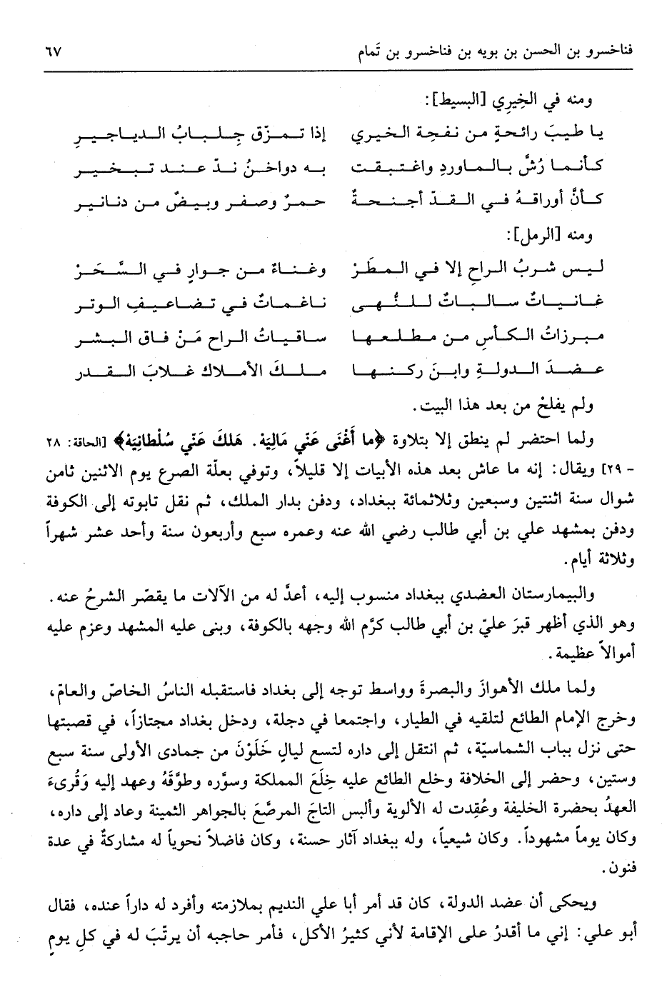 الإِمَام الطائع لتلقيه فِي الطيار واجتمعا فِي دجلة وَدخل بَغْدَاد مجتازاً فِي قصبتها حَتَّى نزل بَاب الشماسية ثمَّ انْتقل إِلَى دَاره لتسْع ليالٍ خلون من جُمَادَى الأولى سنة سبع وَسِتِّينَ وَحضر إِلَى دَار الْخلَافَة وخلع الطائع عَلَيْهِ خلع المملكة وسوره وطوقه وعهد إِلَيْهِ وَقُرِئَ الْعَهْد بِحَضْرَة الْخَلِيفَة وعقدت لَهُ الألوية وألبس التَّاج المرصع بالجواهر الثمينة وَعَاد إِلَى دَاره وَكَانَ يَوْمًا مشهوداً وَكَانَ شِيعِيًّا وَله بَغْدَاد آثَار حَسَنَة
