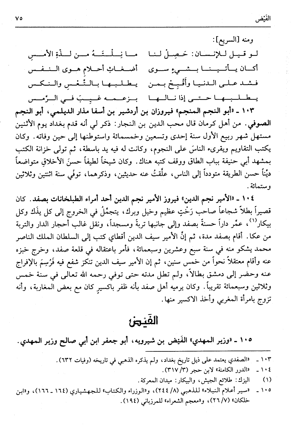 فَيْرُوز نجم الدّين أحد أُمَرَاء الطبلخانات بصفد كَانَ قَصِيرا بطلاً شجاعاً صَاحب رخت عَظِيم وخيل وبرك يتجمل فِي الْخُرُوج إِلَى كل يذك وكل بيكار عمر دَارا بصفد وغلى جَانبهَا تربة ومسجداً وَنقل غَالب أَحْجَار الدَّار والتربة من عكا