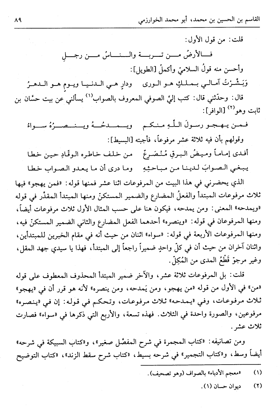 الَّذِي يحضرني فِي هَذَا الْبَيْت من المرفوعات اثْنَا عشر فَمِنْهَا قَوْله فَمن يهجو فِيهَا ثَلَاث مرفوعات الْمُبْتَدَأ وَالْفِعْل الْمُضَارع وَالضَّمِير المستكن وَمِنْهَا الْمُبْتَدَأ الْمُقدر فِي قَوْله ويمدحه الْمَعْنى ون يمدحه فَيكون هُنَا على حسب الْمِثَال الأول ثَلَاث مرفوعات أَيْضا وَمِنْهَا المرفوعان فِي قَوْله وينصره أَحدهمَا الْفِعْل الْمُضَارع وَالثَّانِي الضَّمِير المستكن فِيهِ وَمِنْهَا المرفوعات الْأَرْبَعَة فِي قَوْله سَوَاء اثْنَان من حَيْثُ أهـ فِي مقَام الْخَبَرَيْنِ للمبتدأين وَاثْنَانِ آخرَانِ من حَيْثُ أَفِي كل واجحد ضميراً رَاجعا إِلَى الْمُبْتَدَأ فَهَذَا يَا سَيِّدي جهد الْمقل وَغير مرجو قطع المدى من المكل
